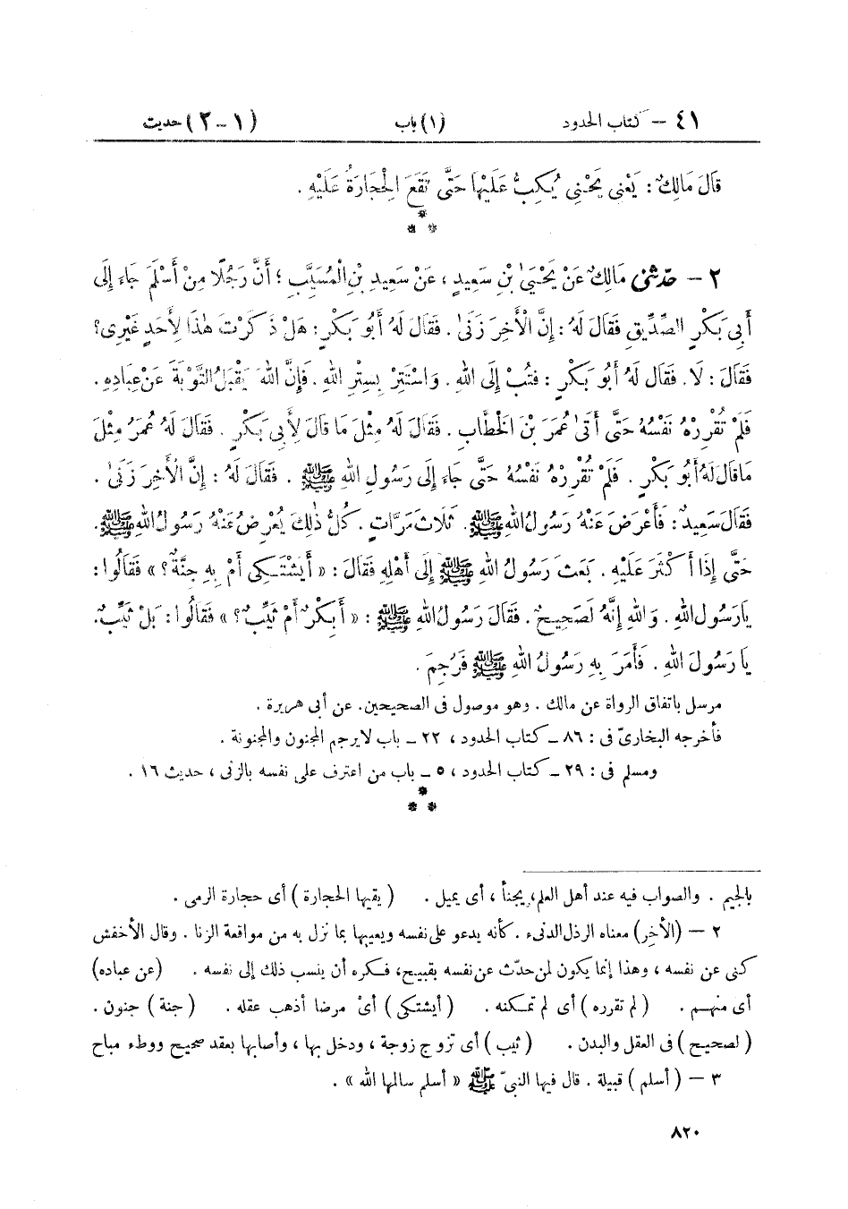 ٢ - حَدَّثَنِي مَالِكٌ، عَنْ يَحْيَى بْنِ سَعِيدٍ، عَنْ سَعِيدِ بْنِ الْمُسَيِّبِ، أَنَّ رَجُلًا مِنْ أَسْلَمَ جَاءَ إِلَى أَبِي بَكْرٍ الصِّدِّيقِ، فَقَالَ لَهُ: إِنَّ الْآخِرَ زَنَى فَقَالَ لَهُ أَبُو بَكْرٍ: هَلْ ذَكَرْتَ هَذَا لِأَحَدٍ غَيْرِي؟ فَقَالَ: لَا. فَقَالَ لَهُ أَبُو بَكْرٍ: «فَتُبْ إِلَى اللَّهِ وَاسْتَتِرْ بِسِتْرِ اللَّهِ، فَإِنَّ اللَّهَ يَقْبَلُ التَّوْبَةَ عَنْ عِبَادِهِ». فَلَمْ تُقْرِرْهُ نَفْسُهُ، حَتَّى أَتَى عُمَرَ بْنَ الْخَطَّابِ فَقَالَ لَهُ مِثْلَ مَا قَالَ لِأَبِي بَكْرٍ فَقَالَ لَهُ عُمَرُ مِثْلَ مَا قَالَ لَهُ أَبُو بَكْرٍ. فَلَمْ تُقْرِرْهُ نَفْسُهُ حَتَّى جَاءَ إِلَى رَسُولِ اللَّهِ صَلَّى اللهُ عَلَيْهِ وَسَلَّمَ. فَقَالَ لَهُ: إِنَّ الْأَخِرَ زَنَى. فَقَالَ سَعِيدٌ: فَأَعْرَضَ عَنْهُ رَسُولُ اللَّهِ صَلَّى اللهُ عَلَيْهِ وَسَلَّمَ ثَلَاثَ مَرَّاتٍ، كُلُّ ذَلِكَ يُعْرِضُ عَنْهُ رَسُولُ اللَّهِ صَلَّى اللهُ عَلَيْهِ وَسَلَّمَ، حَتَّى إِذَا أَكْثَرَ عَلَيْهِ بَعَثَ رَسُولُ اللَّهِ صَلَّى اللهُ عَلَيْهِ وَسَلَّمَ إِلَى أَهْلِهِ فَقَالَ: «أَيَشْتَكِي أَمْ بِهِ جِنَّةٌ؟» فَقَالُوا: يَا رَسُولَ اللَّهِ، وَاللَّهِ إِنَّهُ لَصَحِيحٌ، فَقَالَ رَسُولُ اللَّهِ صَلَّى اللهُ عَلَيْهِ وَسَلَّمَ «أَبِكْرٌ أَمْ ثَيِّبٌ؟» فَقَالُوا: بَلْ ثَيِّبٌ يَا رَسُولَ اللَّهِ، فَأَمَرَ بِهِ رَسُولُ اللَّهِ صَلَّى اللهُ عَلَيْهِ وَسَلَّمَ «فَرُجِمَ»