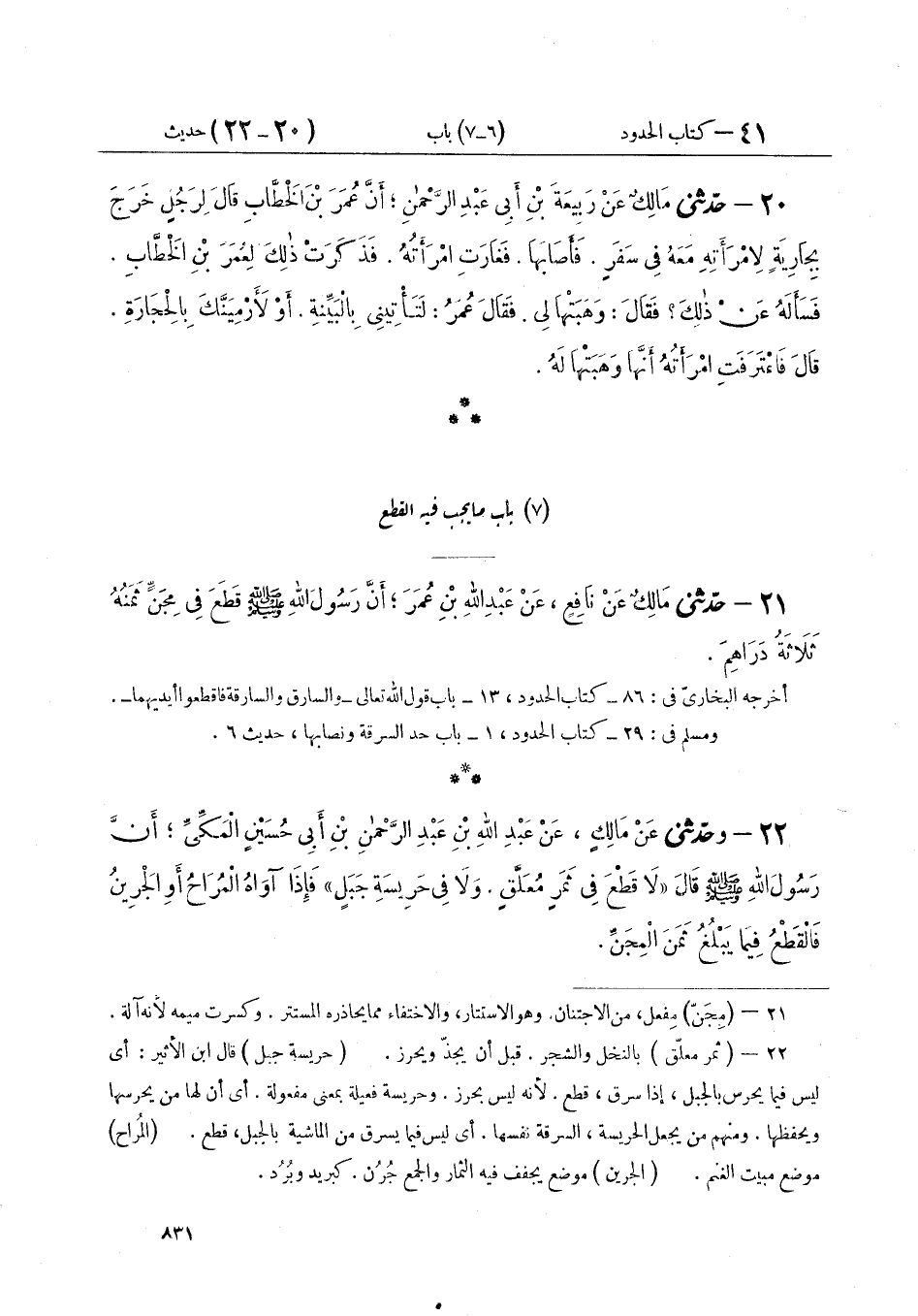 ٢١ - حَدَّثَنِي مَالِكٌ عَنْ نَافِعٍ، عَنْ عَبْدِ اللَّهِ بْنِ عُمَرَ «أَنَّ رَسُولَ اللَّهِ صَلَّى اللهُ عَلَيْهِ وَسَلَّمَ قَطَعَ فِي مِجَنٍّ ثَمَنُهُ ثَلَاثَةُ دَرَاهِمَ»