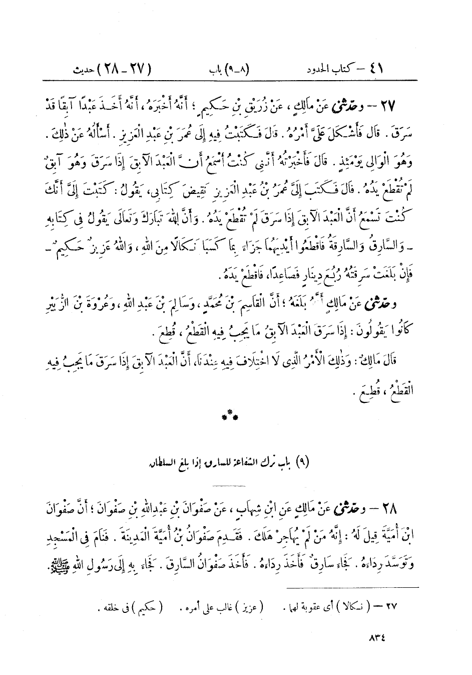 ٢٧ - وَحَدَّثَنِي عَنْ مَالِكٍ، عَنْ رُزَيْقِ بْنِ حَكِيمٍ أَنَّهُ أَخْبَرَهُ، أَنَّهُ أَخَذَ عَبْدًا آبِقًا. قَدْ سَرَقَ قَالَ: فَأَشْكَلَ عَلَيَّ أَمْرُهُ. قَالَ: فَكَتَبْتُ فِيهِ إِلَى عُمَرَ بْنِ عَبْدِ الْعَزِيزِ أَسْأَلُهُ عَنْ ذَلِكَ وَهُوَ الْوَالِي يَوْمَئِذٍ. قَالَ: فَأَخْبَرْتُهُ أَنَّنِي كُنْتُ أَسْمَعُ «أَنَّ الْعَبْدَ الْآبِقَ إِذَا سَرَقَ وَهُوَ آبِقٌ لَمْ تُقْطَعْ يَدُهُ». قَالَ: فَكَتَبَ إِلَيَّ عُمَرُ بْنُ عَبْدِ الْعَزِيزِ نَقِيضَ كِتَابِي يَقُولُ: كَتَبْتَ إِلَيَّ أَنَّكَ كُنْتَ تَسْمَعُ " أَنَّ الْعَبْدَ الْآبِقَ إِذَا سَرَقَ لَمْ تُقْطَعْ يَدُهُ. وَإِنَّ اللَّهَ تَبَارَكَ وَتَعَالَى يَقُولُ فِي كِتَابِهِ {وَالسَّارِقُ وَالسَّارِقَةُ فَاقْطَعُوا أَيْدِيَهُمَا جَزَاءً بِمَا كَسَبَا نَكَالًا مِنَ اللَّهِ وَاللَّهُ عَزِيزٌ حَكِيمٌ} [المائدة: ٣٨] فَإِنْ بَلَغَتْ سَرِقَتُهُ رُبُعَ دِينَارٍ فَصَاعِدًا فَاقْطَعْ يَدَهُ «