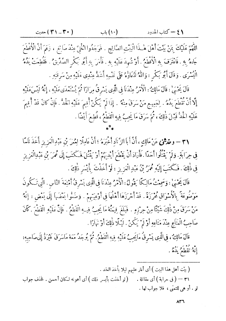 ٣١ - وَحَدَّثَنِي عَنْ مَالِكٍ أَنَّ أَبَا الزِّنَادِ أَخْبَرَهُ أَنَّ عَامِلًا لِعُمَرَ بْنِ عَبْدِ الْعَزِيزِ أَخَذَ نَاسًا فِي حِرَابَةٍ وَلَمْ يَقْتُلُوا أَحَدًا فَأَرَادَ أَنْ يَقْطَعَ أَيْدِيَهُمْ أَوْ يَقْتُلَ، فَكَتَبَ إِلَى عُمَرَ بْنِ عَبْدِ الْعَزِيزِ فِي ذَلِكَ فَكَتَبَ إِلَيْهِ عُمَرُ بْنُ عَبْدِ الْعَزِيزِ: «لَوْ أَخَذْتَ بِأَيْسَرِ ذَلِكَ» قَالَ يَحْيَى وسَمِعْتُ مَالِكًا يَقُولُ الْأَمْرُ عِنْدَنَا فِي الَّذِي يَسْرِقُ أَمْتِعَةَ النَّاسِ الَّتِي تَكُونُ مَوْضُوعَةً بِالْأَسْوَاقِ مُحْرَزَةً قَدْ أَحْرَزَهَا أَهْلُهَا فِي أَوْعِيَتِهِمْ وَضَمُّوا بَعْضَهَا إِلَى بَعْضٍ: «إِنَّهُ مَنْ سَرَقَ مِنْ ذَلِكَ شَيْئًا مِنْ حِرْزِهِ فَبَلَغَ قِيمَتُهُ مَا يَجِبُ فِيهِ الْقَطْعُ فَإِنَّ عَلَيْهِ الْقَطْعَ سَوَاءٌ كَانَ صَاحِبُ الْمَتَاعِ عِنْدَ مَتَاعِهِ أَوْ لَمْ يَكُنْ لَيْلًا ذَلِكَ أَوْ نَهَارًا» قَالَ مَالِكٌ فِي الَّذِي يَسْرِقُ: «مَا يَجِبُ عَلَيْهِ فِيهِ الْقَطْعُ ثُمَّ يُوجَدُ مَعَهُ مَا سَرَقَ فَيُرَدُّ إِلَى صَاحِبِهِ إِنَّهُ تُقْطَعُ يَدُهُ». ⦗٨٣٧⦘ قَالَ مَالِكٌ فَإِنْ قَالَ قَائِلٌ: كَيْفَ تُقْطَعُ يَدُهُ وَقَدْ أُخِذَ الْمَتَاعُ مِنْهُ وَدُفِعَ إِلَى صَاحِبِهِ؟ فَإِنَّمَا هُوَ بِمَنْزِلَةِ الشَّارِبِ. يُوجَدُ مِنْهُ رِيحُ الشَّرَابِ الْمُسْكِرِ. وَلَيْسَ بِهِ سُكْرٌ فَيُجْلَدُ الْحَدَّ. قَالَ: «وَإِنَّمَا يُجْلَدُ الْحَدَّ فِي الْمُسْكِرِ إِذَا شَرِبَهُ. وَإِنْ لَمْ يُسْكِرْهُ وَذَلِكَ أَنَّهُ إِنَّمَا شَرِبَهُ لِيُسْكِرَهُ. فَكَذَلِكَ تُقْطَعُ يَدُ السَّارِقِ فِي السَّرِقَةِ. الَّتِي أُخِذَتْ مِنْهُ وَلَوْ لَمْ يَنْتَفِعْ بِهَا. وَرَجَعَتْ إِلَى صَاحِبِهَا وَإِنَّمَا سَرَقَهَا حِينَ سَرَقَهَا لِيَذْهَبَ بِهَا». قَالَ مَالِكٌ فِي الْقَوْمِ يَأْتُونَ إِلَى الْبَيْتِ فَيَسْرِقُونَ مِنْهُ جَمِيعًا فَيَخْرُجُونَ بِالْعِدْلِ يَحْمِلُونَهُ جَمِيعًا أَوِ الصُّنْدُوقِ أَوِ الْخَشَبَةِ أَوْ بِالْمِكْتَلِ أَوْ مَا أَشْبَهَ ذَلِكَ: " مِمَّا يَحْمِلُهُ الْقَوْمُ جَمِيعًا إِنَّهُمْ إِذَا أَخْرَجُوا ذَلِكَ مِنْ حِرْزِهِ. وَهُمْ يَحْمِلُونَهُ جَمِيعًا. فَبَلَغَ ثَمَنُ مَا خَرَجُوا بِهِ مِنْ ذَلِكَ. مَا يَجِبُ فِيهِ الْقَطْعُ. وَذَلِكَ ثَلَاثَةُ دَرَاهِمَ فَصَاعِدًا فَعَلَيْهِمُ الْقَطْعُ جَمِيعًا. قَالَ: وَإِنْ خَرَجَ كُلُّ وَاحِدٍ مِنْهُمْ بِمَتَاعٍ عَلَى حِدَتِهِ. فَمَنْ خَرَجَ مِنْهُمْ بِمَا تَبْلُغُ قِيمَتُهُ ثَلَاثَةَ دَرَاهِمَ فَصَاعِدًا فَعَلَيْهِ الْقَطْعُ. وَمَنْ لَمْ يَخْرُجْ مِنْهُمْ بِمَا تَبْلُغُ قِيمَتُهُ ثَلَاثَةَ دَرَاهِمَ فَلَا قَطْعَ عَلَيْهِ " قَالَ يَحْيَى: قَالَ مَالِكٌ: «الْأَمْرُ عِنْدَنَا أَنَّهُ إِذَا كَانَتْ دَارُ رَجُلٍ مُغْلَقَةً عَلَيْهِ لَيْسَ مَعَهُ فِيهَا غَيْرُهُ فَإِنَّهُ لَا يَجِبُ عَلَى مَنْ سَرَقَ مِنْهَا شَيْئًا الْقَطْعُ حَتَّى يَخْرُجَ بِهِ مِنَ الدَّارِ كُلِّهَا. وَذَلِكَ أَنَّ الدَّارَ كُلَّهَا هِيَ حِرْزُهُ فَإِنْ كَانَ مَعَهُ فِي الدَّارِ سَاكِنٌ غَيْرُهُ وَكَانَ كُلُّ إِنْسَانٍ مِنْهُمْ يُغْلِقُ عَلَيْهِ بَابَهُ وَكَانَتْ حِرْزًا لَهُمْ جَمِيعًا فَمَنْ سَرَقَ مِنْ بُيُوتِ تِلْكَ الدَّارِ شَيْئًا يَجِبُ فِيهِ الْقَطْعُ فَخَرَجَ بِهِ إِلَى الدَّارِ فَقَدْ أَخْرَجَهُ مِنْ حِرْزِهِ إِلَى غَيْرِ حِرْزِهِ وَوَجَبَ عَلَيْهِ فِيهِ الْقَطْعُ» قَالَ مَالِكٌ وَالْأَمْرُ عِنْدَنَا فِي الْعَبْدِ يَسْرِقُ مِنْ مَتَاعِ سَيِّدِهِ: " أَنَّهُ إِنْ كَانَ لَيْسَ مِنْ خَدَمِهِ.⦗٨٣٨⦘ وَلَا مِمَّنْ يَأْمَنُ عَلَى بَيْتِهِ. ثُمَّ دَخَلَ سِرًّا. فَسَرَقَ مِنْ مَتَاعِ سَيِّدِهِ مَا يَجِبُ فِيهِ الْقَطْعُ. فَلَا قَطْعَ عَلَيْهِ. وَكَ
