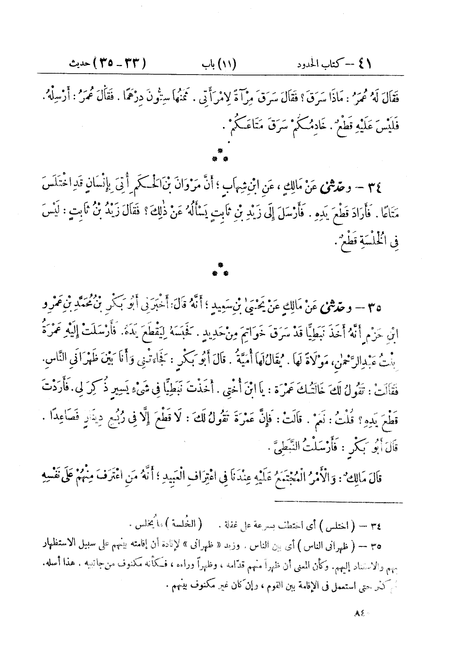 ٣٤ - وَحَدَّثَنِي عَنْ مَالِكٍ، عَنِ ابْنِ شِهَابٍ، أَنَّ مَرْوَانَ بْنَ الْحَكَمِ، أُتِيَ بِإِنْسَانٍ قَدِ اخْتَلَسَ مَتَاعًا فَأَرَادَ قَطْعَ يَدِهِ. فَأَرْسَلَ إِلَى زَيْدِ بْنِ ثَابِتٍ يَسْأَلُهُ عَنْ ذَلِكَ. فَقَالَ زَيْدُ بْنُ ثَابِتٍ: «لَيْسَ فِي الْخُلْسَةِ قَطْعٌ»