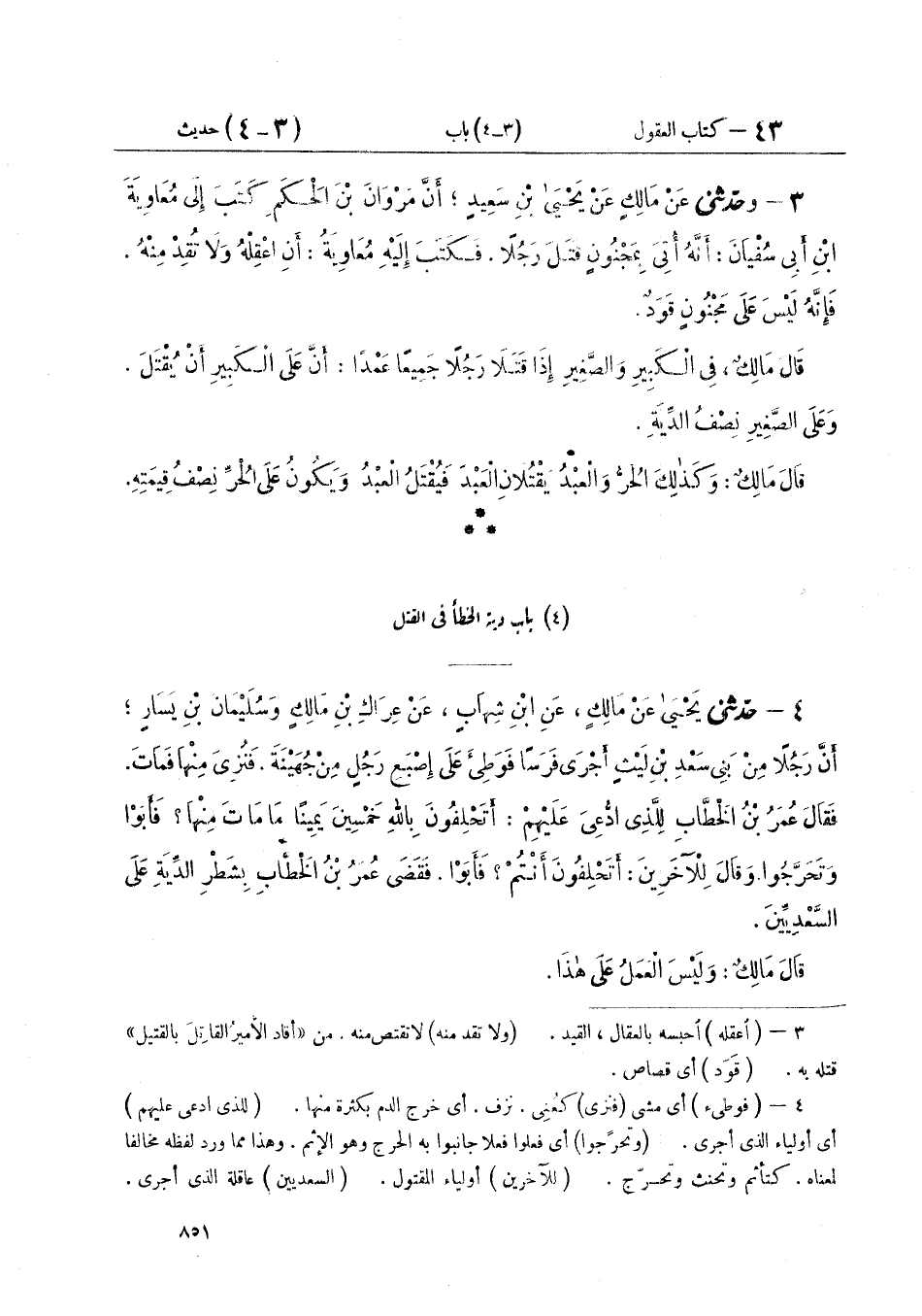 ٣ - وَحَدَّثَنِي عَنْ مَالِكٍ، عَنْ يَحْيَى بْنِ سَعِيدٍ، أَنَّ مَرْوَانَ بْنَ الْحَكَمِ كَتَبَ إِلَى مُعَاوِيَةَ بْنِ أَبِي سُفْيَانَ، أَنَّهُ أُتِيَ بِمَجْنُونٍ قَتَلَ رَجُلًا، فَكَتَبَ إِلَيْهِ مُعَاوِيَةُ، «أَنِ اعْقِلْهُ وَلَا تُقِدْ مِنْهُ، فَإِنَّهُ لَيْسَ عَلَى مَجْنُونٍ قَوَدٌ» قَالَ مَالِكٌ: «فِي الْكَبِيرِ وَالصَّغِيرِ إِذَا قَتَلَا رَجُلًا جَمِيعًا عَمْدًا أَنَّ عَلَى الْكَبِيرِ أَنْ يُقْتَلَ، وَعَلَى الصَّغِيرِ نِصْفُ الدِّيَةِ». قَالَ مَالِكٌ: «وَكَذَلِكَ الْحُرُّ وَالْعَبْدُ يَقْتُلَانِ الْعَبْدَ فَيُقْتَلُ الْعَبْدُ، وَيَكُونُ عَلَى الْحُرِّ نِصْفُ قِيمَتِهِ»