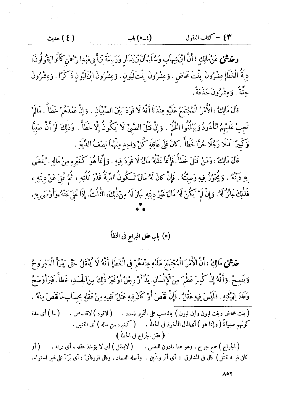 حَدَّثَنِي مَالِكٌ، «أَنَّ الْأَمْرَ الْمُجْتَمَعُ عَلَيْهِ عِنْدَهُمْ فِي الْخَطَإِ، أَنَّهُ لَا يُعْقَلُ حَتَّى يَبْرَأَ الْمَجْرُوحُ، وَيَصِحَّ وَأَنَّهُ إِنْ كُسِرَ عَظْمٌ مِنَ الْإِنْسَانِ يَدٌ أَوْ رِجْلٌ أَوْ غَيْرُ ذَلِكَ مِنَ الْجَسَدِ خَطَأً، فَبَرَأَ وَصَحَّ وَعَادَ لِهَيْئَتِهِ، فَلَيْسَ فِيهِ عَقْلٌ، فَإِنْ نَقَصَ أَوْ كَانَ فِيهِ عَثَلٌ فَفِيهِ مِنْ عَقْلِهِ بِحِسَابِ مَا نَقَصَ مِنْهُ». ⦗٨٥٣⦘ قَالَ مَالِكٌ: «فَإِنْ كَانَ ذَلِكَ الْعَظْمُ مِمَّا جَاءَ فِيهِ عَنِ النَّبِيِّ صَلَّى اللهُ عَلَيْهِ وَسَلَّمَ عَقْلٌ مُسَمًّى، فَبِحِسَابِ مَا فَرَضَ فِيهِ النَّبِيُّ صَلَّى اللهُ عَلَيْهِ وَسَلَّمَ، وَمَا كَانَ مِمَّا لَمْ يَأْتِ فِيهِ عَنِ النَّبِيِّ صَلَّى اللهُ عَلَيْهِ وَسَلَّمَ عَقْلٌ مُسَمًّى، وَلَمْ تَمْضِ فِيهِ سُنَّةٌ، وَلَا عَقْلٌ مُسَمًّى، فَإِنَّهُ يُجْتَهَدُ فِيهِ». قَالَ مَالِكٌ: «وَلَيْسَ فِي الْجِرَاحِ فِي الْجَسَدِ إِذَا كَانَتْ خَطَأً عَقْلٌ إِذَا بَرَأَ الْجُرْحُ، وَعَادَ لِهَيْئَتِهِ، فَإِنْ كَانَ فِي شَيْءٍ مِنْ ذَلِكَ عَثَلٌ أَوْ شَيْنٌ، فَإِنَّهُ يُجْتَهَدُ فِيهِ إِلَّا الْجَائِفَةَ، فَإِنَّ فِيهَا ثُلُثَ دِيَةِ النَّفْسِ». قَالَ مَالِكٌ: «وَلَيْسَ فِي مُنَقِّلَةِ الْجَسَدِ عَقْلٌ، وَهِيَ مِثْلُ مُوضِحَةِ الْجَسَدِ». قَالَ مَالِكٌ: " الْأَمْرُ الْمُجْتَمَعُ عَلَيْهِ عِنْدَنَا: أَنَّ الطَّبِيبَ إِذَا خَتَنَ، فَقَطَعَ الْحَشَفَةَ إِنَّ عَلَيْهِ الْعَقْلَ، وَأَنَّ ذَلِكَ مِنَ الْخَطَإِ الَّذِي تَحْمِلُهُ الْعَاقِلَةُ، وَأَنَّ كُلَّ مَا أَخْطَأَ بِهِ الطَّبِيبُ أَوْ تَعَدَّى إِذَا لَمْ يَتَعَمَّدْ ذَلِكَ، فَفِيهِ الْعَقْلُ "