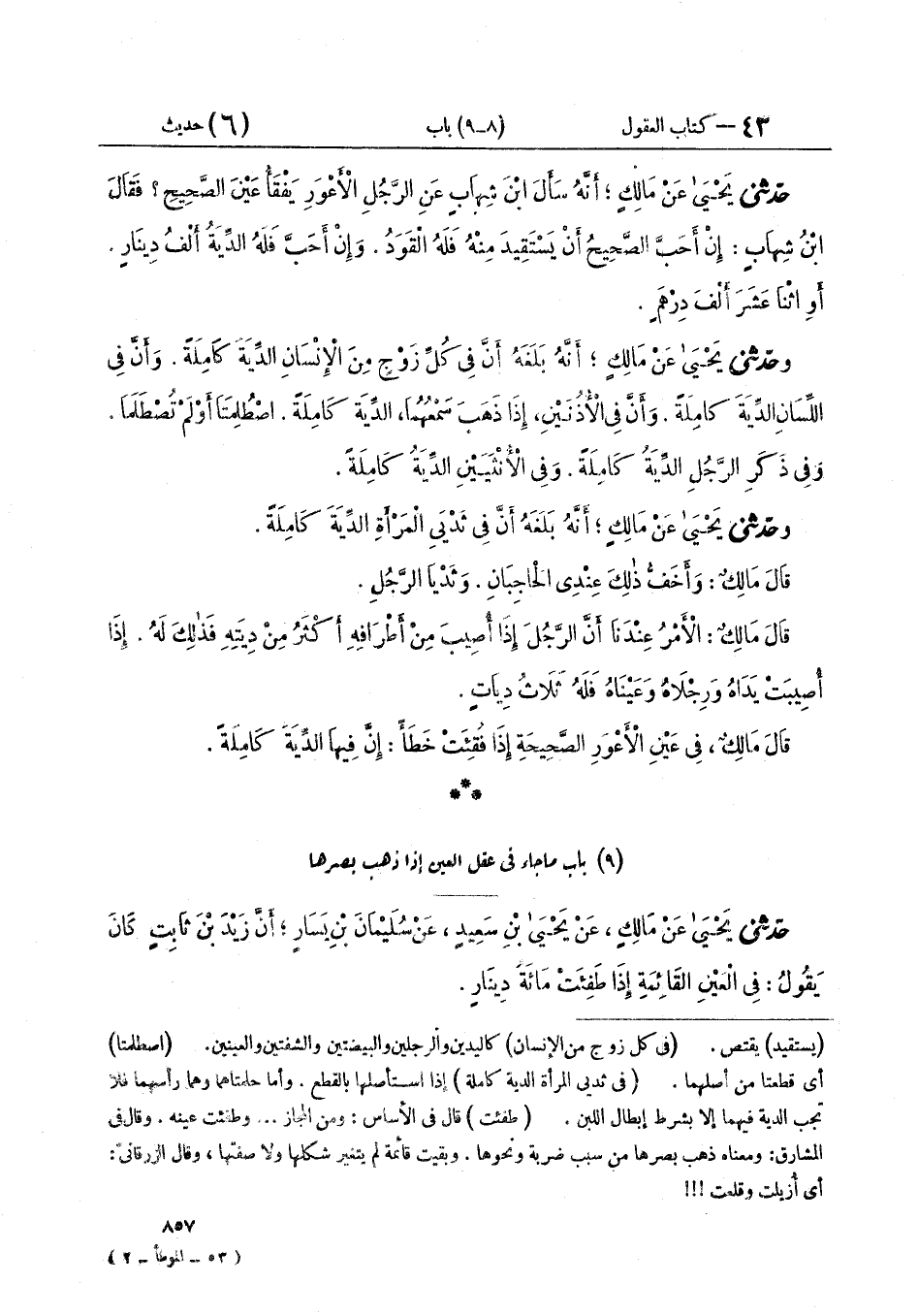 حَدَّثَنِي يَحْيَى، عَنْ مَالِكٍ، عَنْ يَحْيَى بْنِ سَعِيدٍ، عَنْ سُلَيْمَانَ بْنِ يَسَارٍ، أَنَّ زَيْدَ بْنَ ثَابِتٍ، كَانَ يَقُولُ: «فِي الْعَيْنِ الْقَائِمَةِ إِذَا طَفِئَتْ مِائَةُ دِينَارٍ» ⦗٨٥٨⦘ قَالَ يَحْيَى: وسُئِلَ مَالِكٌ عَنْ شَتَرِ الْعَيْنِ، وَحِجَاجِ الْعَيْنِ، فَقَالَ: «لَيْسَ فِي ذَلِكَ إِلَّا الِاجْتِهَادُ إِلَّا أَنْ يَنْقُصَ بَصَرُ الْعَيْنِ، فَيَكُونُ لَهُ بِقَدْرِ مَا نَقَصَ مِنْ بَصَرِ الْعَيْنِ». قَالَ يَحْيَى قَالَ مَالِكٌ: «الْأَمْرُ عِنْدَنَا فِي الْعَيْنِ الْقَائِمَةِ الْعَوْرَاءِ، إِذَا طَفِئَتْ، وَفِي الْيَدِ الشَّلَّاءِ إِذَا قُطِعَتْ، إِنَّهُ لَيْسَ فِي ذَلِكَ إِلَّا الِاجْتِهَادُ، وَلَيْسَ فِي ذَلِكَ عَقْلٌ مُسَمًّى»