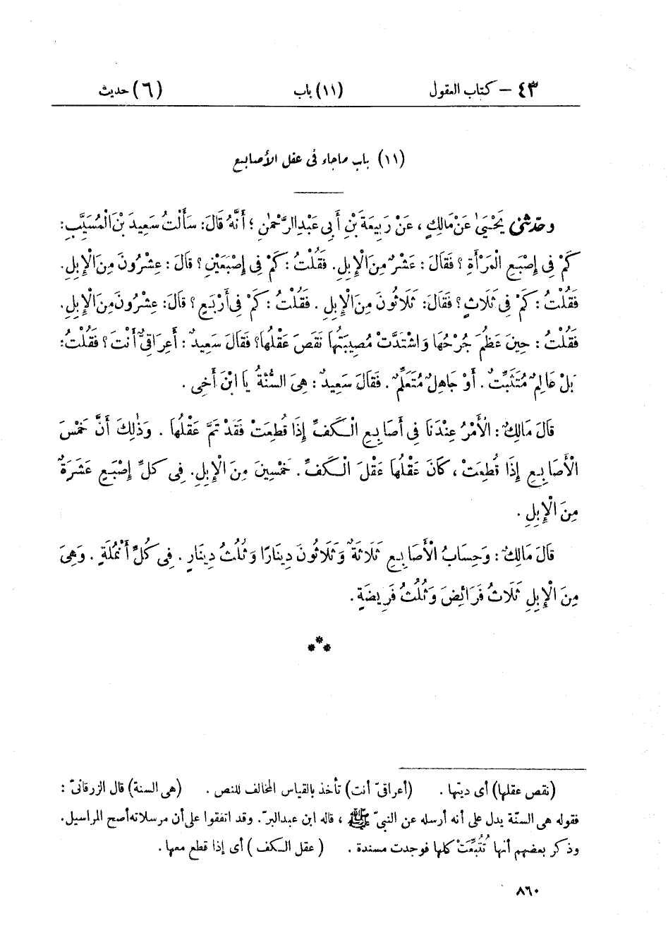 وَحَدَّثَنِي يَحْيَى، عَنْ مَالِكٍ، عَنْ رَبِيعَةَ بْنِ أَبِي عَبْدِ الرَّحْمَنِ، أَنَّهُ قَالَ: سَأَلْتُ سَعِيدَ بْنَ الْمُسَيِّبِ: كَمْ فِي إِصْبَعِ الْمَرْأَةِ؟ فَقَالَ: «عَشْرٌ مِنَ الْإِبِلِ» فَقُلْتُ: كَمْ فِي إِصْبَعَيْنِ؟ قَالَ: عِشْرُونَ مِنَ الْإِبِلِ، فَقُلْتُ: كَمْ فِي ثَلَاثٍ؟ فَقَالَ: «ثَلَاثُونَ مِنَ الْإِبِلِ» فَقُلْتُ: كَمْ فِي أَرْبَعٍ؟ قَالَ: «عِشْرُونَ مِنَ الْإِبِلِ» فَقُلْتُ: حِينَ عَظُمَ جُرْحُهَا، وَاشْتَدَّتْ مُصِيبَتُهَا، نَقَصَ عَقْلُهَا؟ فَقَالَ سَعِيدٌ: «أَعِرَاقِيٌّ أَنْتَ؟» فَقُلْتُ: بَلْ عَالِمٌ مُتَثَبِّتٌ، أَوْ جَاهِلٌ مُتَعَلِّمٌ، فَقَالَ سَعِيدٌ: «هِيَ السُّنَّةُ يَا ابْنَ أَخِي» قَالَ مَالِكٌ: «الْأَمْرُ عِنْدَنَا فِي أَصَابِعِ الْكَفِّ، إِذَا قُطِعَتْ فَقَدْ تَمَّ عَقْلُهَا، وَذَلِكَ أَنَّ خَمْسَ الْأَصَابِعِ إِذَا قُطِعَتْ كَانَ عَقْلُهَا عَقْلَ الْكَفِّ، خَمْسِينَ مِنَ الْإِبِلِ، فِي كُلِّ إِصْبَعٍ عَشَرَةٌ مِنَ الْإِبِلِ»، قَالَ مَالِكٌ: «وَحِسَابُ الْأَصَابِعِ ثَلَاثَةٌ وَثَلَاثُونَ دِينَارًا، وَثُلُثُ دِينَارٍ فِي كُلِّ أُنْمُلَةٍ، وَهِيَ مِنَ الْإِبِلِ ثَلَاثُ فَرَائِضَ وَثُلُثُ فَرِيضَةٍ»