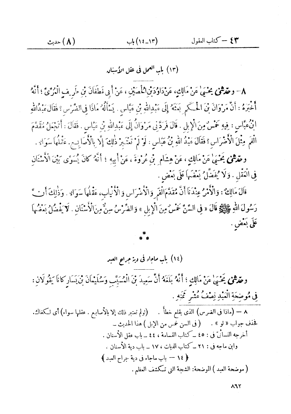 ٨ - وَحَدَّثَنِي يَحْيَى، عَنْ مَالِكٍ، عَنْ دَاوُدَ بْنِ الْحُصَيْنِ، عَنْ أَبِي غَطَفَانَ بْنِ طَرِيفٍ الْمُرِّيِّ، أَنَّهُ أَخْبَرَهُ، أَنَّ مَرْوَانَ بْنَ الْحَكَمِ بَعَثَهُ إِلَى عَبْدِ اللَّهِ بْنِ عَبَّاسٍ يَسْأَلُهُ: مَاذَا فِي الضِّرْسِ، فَقَالَ عَبْدُ اللَّهِ بْنُ عَبَّاسٍ: «فِيهِ خَمْسٌ مِنَ الْإِبِلِ». قَالَ فَرَدَّنِي مَرْوَانُ إِلَى عَبْدِ اللَّهِ بْنِ عَبَّاسٍ فَقَالَ: أَتَجْعَلُ مُقَدَّمَ الْفَمِ مِثْلَ الْأَضْرَاسِ، فَقَالَ عَبْدُ اللَّهِ بْنُ عَبَّاسٍ: «لَوْ لَمْ تَعْتَبِرْ ذَلِكَ إِلَّا بِالْأَصَابِعِ عَقْلُهَا سَوَاءٌ»