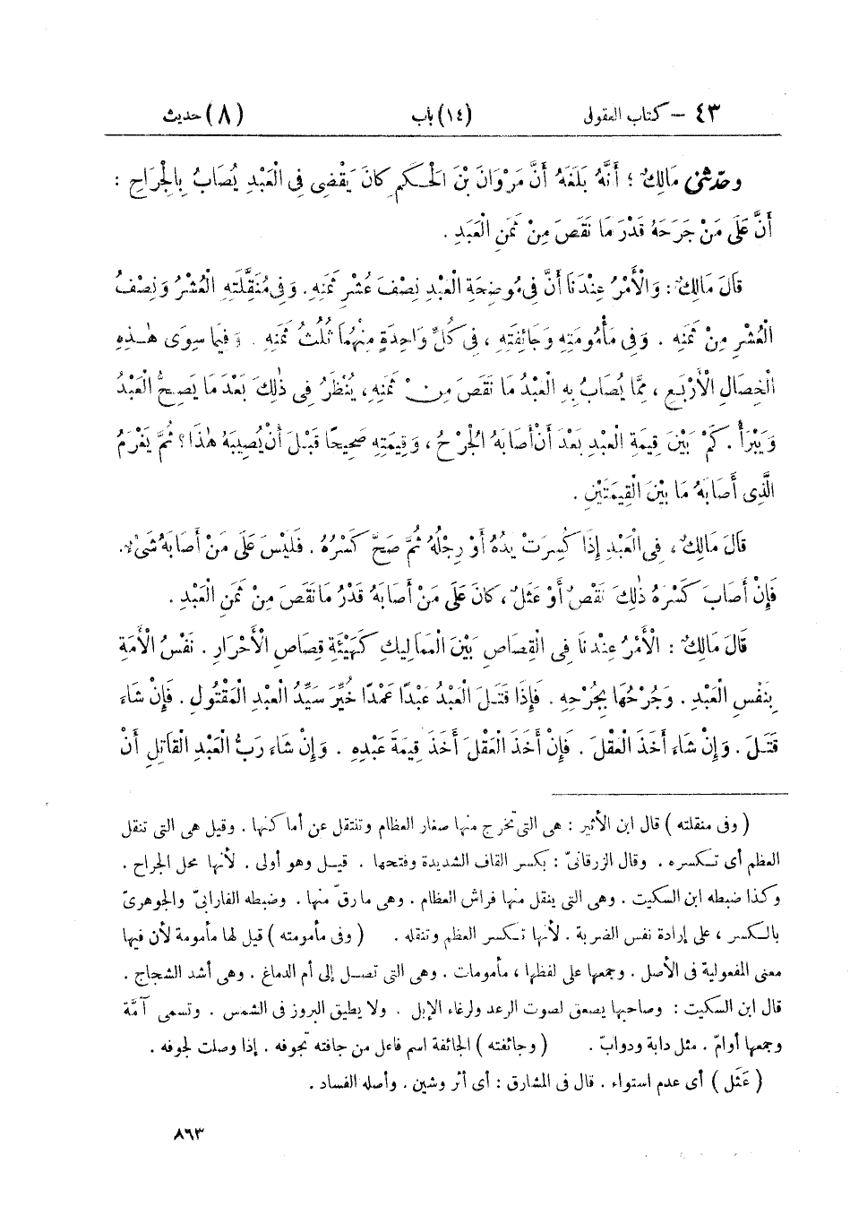 وحَدَّثَنِي مَالِكٌ، أَنَّهُ بَلَغَهُ أَنَّ مَرْوَانَ بْنَ الْحَكَمِ «كَانَ يَقْضِي فِي الْعَبْدِ يُصَابُ بِالْجِرَاحِ أَنَّ عَلَى مَنْ جَرَحَهُ قَدْرَ مَا نَقَصَ مِنْ ثَمَنِ الْعَبْدِ». قَالَ مَالِكٌ: «وَالْأَمْرُ عِنْدَنَا أَنَّ فِي مُوضِحَةِ الْعَبْدِ نِصْفَ عُشْرِ ثَمَنِهِ، وَفِي مُنَقِّلَتِهِ الْعُشْرُ وَنِصْفُ الْعُشْرِ مِنْ ثَمَنِهِ، وَفِي مَأْمُومَتِهِ وَجَائِفَتِهِ فِي كُلِّ وَاحِدَةٍ مِنْهُمَا ثُلُثُ ثَمَنِهِ، وَفِيمَا سِوَى هَذِهِ الْخِصَالِ الْأَرْبَعِ مِمَّا يُصَابُ بِهِ الْعَبْدُ مَا نَقَصَ مِنْ ثَمَنِهِ يُنْظَرُ فِي ذَلِكَ بَعْدَ مَا يَصِحُّ الْعَبْدُ، وَيَبْرَأُ كَمْ بَيْنَ قِيمَةِ الْعَبْدِ بَعْدَ أَنْ أَصَابَهُ الْجُرْحُ، وَقِيمَتِهِ صَحِيحًا قَبْلَ أَنْ يُصِيبَهُ هَذَا، ثُمَّ يَغْرَمُ الَّذِي أَصَابَهُ مَا بَيْنَ الْقِيمَتَيْنِ». قَالَ مَالِكٌ: «فِي الْعَبْدِ إِذَا كُسِرَتْ يَدُهُ أَوْ رِجْلُهُ، ثُمَّ صَحَّ كَسْرُهُ فَلَيْسَ عَلَى مَنْ أَصَابَهُ شَيْءٌ، فَإِنْ أَصَابَ كَسْرَهُ ذَلِكَ نَقْصٌ أَوْ عَثَلٌ كَانَ عَلَى مَنْ أَصَابَهُ قَدْرُ مَا نَقَصَ مِنْ ثَمَنِ الْعَبْدِ» قَالَ مَالِكٌ: «الْأَمْرُ عِنْدَنَا فِي الْقِصَاصِ بَيْنَ الْمَمَالِيكِ، كَهَيْئَةِ قِصَاصِ الْأَحْرَارِ نَفْسُ الْأَمَةِ بِنَفْسِ الْعَبْدِ، وَجُرْحُهَا بِجُرْحِهِ، فَإِذَا قَتَلَ الْعَبْدُ عَبْدًا عَمْدًا خُيِّرَ سَيِّدُ الْعَبْدِ الْمَقْتُولِ، فَإِنْ شَاءَ قَتَلَ، وَإِنْ شَاءَ أَخَذَ الْعَقْلَ، فَإِنْ أَخَذَ الْعَقْلَ أَخَذَ قِيمَةَ عَبْدِهِ، وَإِنْ شَاءَ رَبُّ الْعَبْدِ الْقَاتِلِ أَنْ ⦗٨٦٤⦘ يُعْطِيَ ثَمَنَ الْعَبْدِ الْمَقْتُولِ فَعَلَ، وَإِنْ شَاءَ أَسْلَمَ عَبْدَهُ، فَإِذَا أَسْلَمَهُ فَلَيْسَ عَلَيْهِ غَيْرُ ذَلِكَ، وَلَيْسَ لِرَبِّ الْعَبْدِ الْمَقْتُولِ إِذَا أَخَذَ الْعَبْدَ الْقَاتِلَ، وَرَضِيَ بِهِ أَنْ يَقْتُلَهُ، وَذَلِكَ فِي الْقِصَاصِ كُلِّهِ بَيْنَ الْعَبِيدِ فِي قَطْعِ الْيَدِ وَالرِّجْلِ وَأَشْبَاهِ ذَلِكَ بِمَنْزِلَتِهِ فِي الْقَتْلِ» قَالَ مَالِكٌ: «فِي الْعَبْدِ الْمُسْلِمِ يَجْرَحُ الْيَهُودِيَّ أَوِ النَّصْرَانِيَّ إِنَّ سَيِّدَ الْعَبْدِ إِنْ شَاءَ أَنْ يَعْقِلَ عَنْهُ مَا قَدْ أَصَابَ فَعَلَ، أَوْ أَسْلَمَهُ، فَيُبَاعُ فَيُعْطِي الْيَهُودِيَّ أَوِ النَّصْرَانِيَّ مِنْ ثَمَنِ الْعَبْدِ دِيَةَ جُرْحِهِ أَوْ ثَمَنَهُ كُلَّهُ إِنْ أَحَاطَ بِثَمَنِهِ، وَلَا يُعْطِي الْيَهُودِيَّ وَلَا النَّصْرَانِيَّ عَبْدًا مُسْلِمًا»