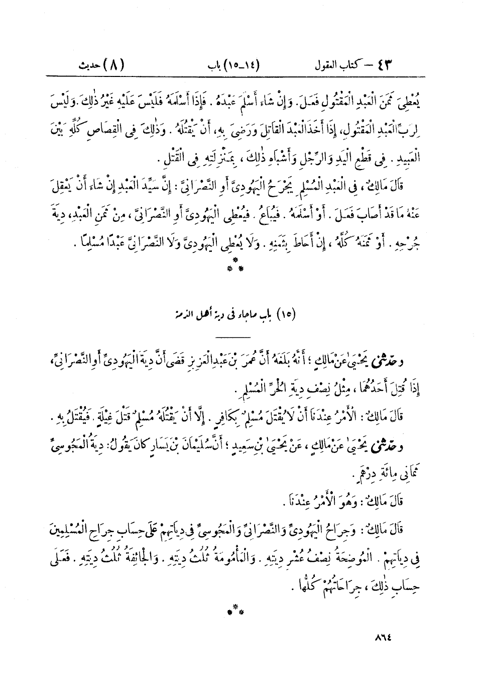 وَحَدَّثَنِي يَحْيَى، عَنْ مَالِكٍ أَنَّهُ بَلَغَهُ أَنَّ عُمَرَ بْنَ عَبْدِ الْعَزِيزِ، قَضَى أَنَّ «دِيَةَ الْيَهُودِيِّ أَوِ النَّصْرَانِيِّ إِذَا قُتِلَ أَحَدُهُمَا مِثْلُ نِصْفِ دِيَةِ الْحُرِّ الْمُسْلِمِ» قَالَ مَالِكٌ: «الْأَمْرُ عِنْدَنَا أَنْ لَا يُقْتَلَ مُسْلِمٌ بِكَافِرٍ، إِلَّا أَنْ يَقْتُلَهُ مُسْلِمٌ قَتْلَ غِيلَةٍ فَيُقْتَلُ بِهِ»