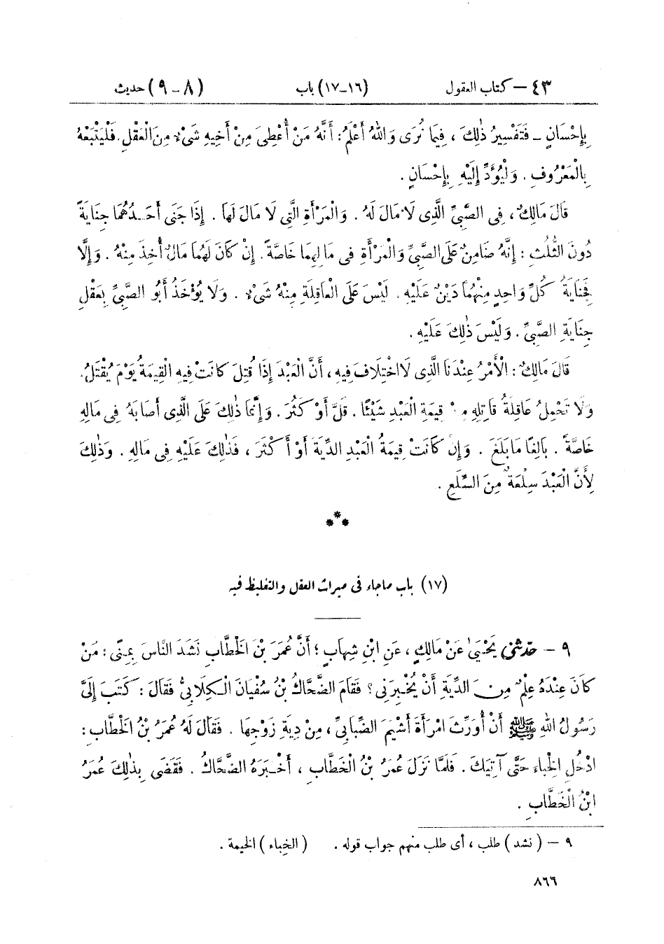 ٩ - حَدَّثَنِي يَحْيَى، عَنْ مَالِكٍ، عَنْ ابْنِ شِهَابٍ، أَنَّ عُمَرَ بْنَ الْخَطَّابِ، نَشَدَ النَّاسَ بِمِنًى: مَنْ كَانَ عِنْدَهُ عِلْمٌ مِنَ الدِّيَةِ أَنْ يُخْبِرَنِي، فَقَامَ الضَّحَّاكُ بْنُ سُفْيَانَ الْكِلَابِيُّ فَقَالَ: «كَتَبَ إِلَيَّ رَسُولُ اللَّهِ صَلَّى اللهُ عَلَيْهِ وَسَلَّمَ أَنْ أُوَرِّثَ امْرَأَةَ أَشْيَمَ الضِّبَابِيِّ مِنْ دِيَةِ زَوْجِهَا» فَقَالَ لَهُ عُمَرُ بْنُ الْخَطَّابِ: ادْخُلِ الْخِبَاءَ حَتَّى آتِيَكَ، فَلَمَّا نَزَلَ عُمَرُ بْنُ الْخَطَّابِ أَخْبَرَهُ الضَّحَّاكُ، فَقَضَى بِذَلِكَ عُمَرُ بْنُ الْخَطَّابِ ⦗٨٦٧⦘ قَالَ ابْنُ شِهَابٍ: «وَكَانَ قَتْلُ أَشْيَمَ خَطَأً»