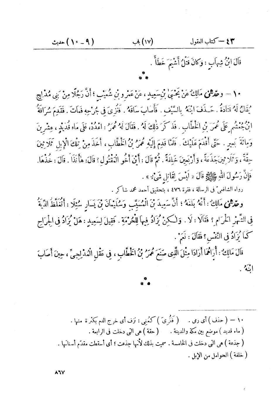 ١٠ - وَحَدَّثَنِي مَالِكٌ، عَنْ يَحْيَى بْنِ سَعِيدٍ، عَنْ عَمْرِو بْنِ شُعَيْبٍ، أَنَّ رَجُلًا مِنْ بَنِي مُدْلِجٍ يُقَالُ لَهُ قَتَادَةُ، حَذَفَ ابْنَهُ بِالسَّيْفِ، فَأَصَابَ سَاقَهُ، فَنُزِيَ فِي جُرْحِهِ فَمَاتَ، فَقَدِمَ سُرَاقَةُ بْنُ جُعْشُمٍ عَلَى عُمَرَ بْنِ الْخَطَّابِ، فَذَكَرَ ذَلِكَ لَهُ، فَقَالَ لَهُ عُمَرُ: اعْدُدْ عَلَى مَاءِ قُدَيْدٍ عِشْرِينَ وَمِائَةَ بَعِيرٍ حَتَّى أَقْدَمَ عَلَيْكَ، فَلَمَّا قَدِمَ إِلَيْهِ عُمَرُ بْنُ الْخَطَّابِ، أَخَذَ مِنْ تِلْكَ الْإِبِلِ ثَلَاثِينَ حِقَّةً، وَثَلَاثِينَ جَذَعَةً، وَأَرْبَعِينَ خَلِفَةً، ثُمَّ قَالَ: «أَيْنَ أَخُو الْمَقْتُولِ؟» قَالَ: هَأَنَذَا، قَالَ: خُذْهَا فَإِنَّ رَسُولَ اللَّهِ صَلَّى اللهُ عَلَيْهِ وَسَلَّمَ قَالَ: «لَيْسَ لِقَاتِلٍ شَيْءٌ»