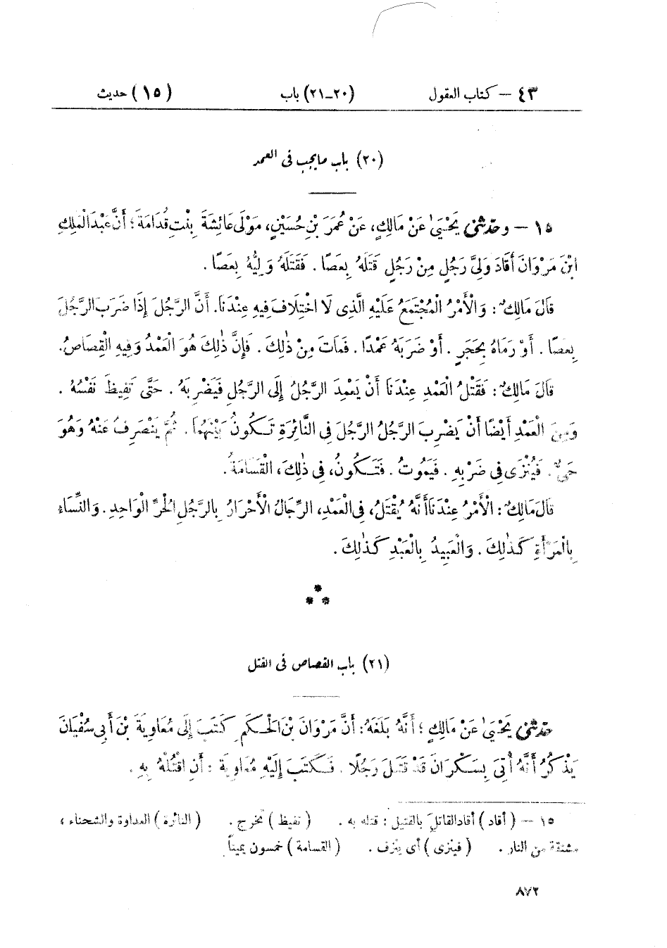 ١٥ - وَحَدَّثَنِي يَحْيَى، عَنْ مَالِكٍ، عَنْ عُمَرَ بْنِ حُسَيْنٍ مَوْلَى عَائِشَةَ بِنْتِ قُدَامَةَ، أَنَّ عَبْدَ الْمَلِكِ بْنَ مَرْوَانَ، «أَقَادَ وَلِيَّ رَجُلٍ مِنْ رَجُلٍ قَتَلَهُ بِعَصًا فَقَتَلَهُ وَلِيُّهُ بِعَصًا» قَالَ مَالِكٌ: «وَالْأَمْرُ الْمُجْتَمَعُ عَلَيْهِ الَّذِي لَا اخْتِلَافَ فِيهِ عِنْدَنَا، أَنَّ الرَّجُلَ إِذَا ضَرَبَ الرَّجُلَ بِعَصًا أَوْ رَمَاهُ بِحَجَرٍ أَوْ ضَرَبَهُ عَمْدًا فَمَاتَ مِنْ ذَلِكَ. فَإِنَّ ذَلِكَ هُوَ الْعَمْدُ وَفِيهِ الْقِصَاصُ». قَالَ مَالِكٌ: «فَقَتْلُ الْعَمْدِ عِنْدَنَا أَنْ يَعْمِدَ الرَّجُلُ إِلَى الرَّجُلِ فَيَضْرِبَهُ حَتَّى تَفِيظَ نَفْسُهُ، وَمِنَ الْعَمْدِ أَيْضًا أَنْ يَضْرِبَ الرَّجُلُ الرَّجُلَ فِي النَّائِرَةِ تَكُونُ بَيْنَهُمَا ثُمَّ يَنْصَرِفُ عَنْهُ وَهُوَ حَيٌّ فَيُنْزَى فِي ضَرْبِهِ فَيَمُوتُ فَتَكُونُ فِي ذَلِكَ الْقَسَامَةُ». قَالَ مَالِكٌ: «الْأَمْرُ عِنْدَنَا أَنَّهُ يُقْتَلُ فِي الْعَمْدِ الرِّجَالُ الْأَحْرَارُ بِالرَّجُلِ الْحُرِّ الْوَاحِدِ، وَالنِّسَاءُ بِالْمَرْأَةِ كَذَلِكَ، وَالْعَبِيدُ بِالْعَبْدِ كَذَلِكَ»