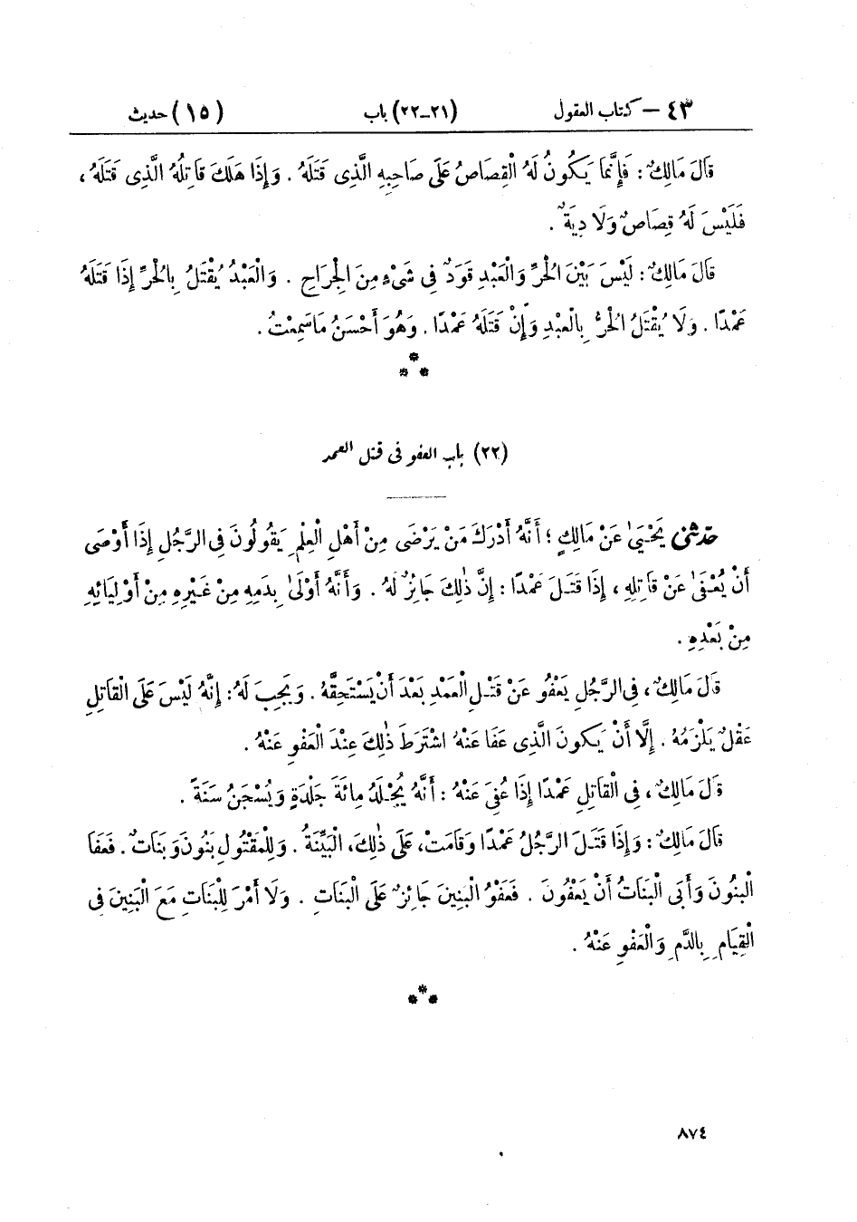 حَدَّثَنِي يَحْيَى، عَنْ مَالِكٍ، أَنَّهُ أَدْرَكَ مَنْ يَرْضَى مِنْ أَهْلِ الْعِلْمِ، يَقُولُونَ: " فِي الرَّجُلِ إِذَا أَوْصَى أَنْ يُعْفَى عَنْ قَاتِلِهِ، إِذَا قَتَلَ عَمْدًا: إِنَّ ذَلِكَ جَائِزٌ لَهُ. وَأَنَّهُ أَوْلَى بِدَمِهِ مِنْ غَيْرِهِ مِنْ أَوْلِيَائِهِ مِنْ بَعْدِهِ ". قَالَ مَالِكٌ: " فِي الرَّجُلِ يَعْفُو عَنْ قَتْلِ الْعَمْدِ بَعْدَ أَنْ يَسْتَحِقَّهُ، وَيَجِبَ لَهُ: إِنَّهُ لَيْسَ عَلَى الْقَاتِلِ عَقْلٌ يَلْزَمُهُ. إِلَّا أَنْ يَكُونَ الَّذِي عَفَا عَنْهُ اشْتَرَطَ ذَلِكَ عِنْدَ الْعَفْوِ عَنْهُ ". قَالَ مَالِكٌ: " فِي الْقَاتِلِ عَمْدًا إِذَا عُفِيَ عَنْهُ: أَنَّهُ يُجْلَدُ مِائَةَ جَلْدَةٍ وَيُسْجَنُ سَنَةً ". قَالَ مَالِكٌ: «وَإِذَا قَتَلَ الرَّجُلُ عَمْدًا وَقَامَتْ عَلَى ذَلِكَ، الْبَيِّنَةُ. وَلِلْمَقْتُولِ بَنُونَ وَبَنَاتٌ، فَعَفَا الْبَنُونَ وَأَبَى الْبَنَاتُ أَنْ يَعْفُونَ، فَعَفْوُ الْبَنِينَ جَائِزٌ عَلَى الْبَنَاتِ، وَلَا أَمْرَ لِلْبَنَاتِ مَعَ الْبَنِينَ فِي الْقِيَامِ بِالدَّمِ وَالْعَفْوِ عَنْهُ»