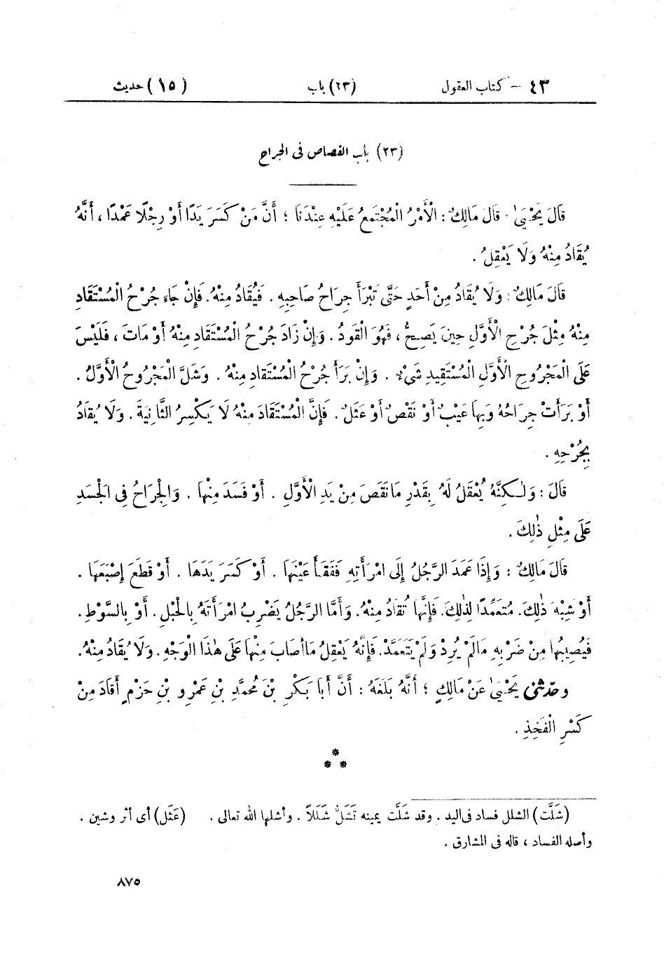 بَابُ الْقِصَاصِ فِي الْجِرَاحِ قَالَ يَحْيَى: قَالَ مَالِكٌ: «الْأَمْرُ الْمُجْتَمَعُ عَلَيْهِ عِنْدَنَا أَنَّ مَنْ كَسَرَ يَدًا، أَوْ رِجْلًا عَمْدًا أَنَّهُ يُقَادُ مِنْهُ، وَلَا يَعْقِلُ». قَالَ مَالِكٌ: " وَلَا يُقَادُ مِنْ أَحَدٍ حَتَّى تَبْرَأَ جِرَاحُ صَاحِبِهِ، فَيُقَادُ مِنْهُ، فَإِنْ جَاءَ جُرْحُ الْمُسْتَقَادِ مِنْهُ مِثْلَ جُرْحِ الْأَوَّلِ حِينَ يَصِحُّ فَهُوَ الْقَوَدُ، وَإِنْ زَادَ جُرْحُ الْمُسْتَقَادِ مِنْهُ أَوْ مَاتَ فَلَيْسَ عَلَى الْمَجْرُوحِ الْأَوَّلِ الْمُسْتَقِيدِ شَيْءٌ، وَإِنْ بَرَأَ جُرْحُ الْمُسْتَقَادِ مِنْهُ، وَشَلَّ الْمَجْرُوحُ الْأَوَّلُ، أَوْ بَرَأَتْ جِرَاحُهُ، وَبِهَا عَيْبٌ أَوْ نَقْصٌ أَوْ عَثَلٌ، فَإِنَّ الْمُسْتَقَادَ مِنْهُ لَا يَكْسِرُ الثَّانِيَةَ، وَلَا يُقَادُ بِجُرْحِهِ، قَالَ: وَلَكِنَّهُ يُعْقَلُ لَهُ بِقَدْرِ مَا نَقَصَ مِنْ يَدِ الْأَوَّلِ أَوْ فَسَدَ مِنْهَا، وَالْجِرَاحُ فِي الْجَسَدِ عَلَى مِثْلِ ذَلِكَ ". قَالَ مَالِكٌ: «وَإِذَا عَمَدَ الرَّجُلُ إِلَى امْرَأَتِهِ، فَفَقَأَ عَيْنَهَا، أَوْ كَسَرَ يَدَهَا، أَوْ قَطَعَ إِصْبَعَهَا، أَوْ شِبْهَ ذَلِكَ مُتَعَمِّدًا لِذَلِكَ، فَإِنَّهَا تُقَادُ مِنْهُ، وَأَمَّا الرَّجُلُ يَضْرِبُ امْرَأَتَهُ بِالْحَبْلِ أَوْ بِالسَّوْطِ فَيُصِيبُهَا مِنْ ضَرْبِهِ مَا لَمْ يُرِدْ، وَلَمْ يَتَعَمَّدْ، فَإِنَّهُ يَعْقِلُ مَا أَصَابَ مِنْهَا عَلَى هَذَا الْوَجْهِ، وَلَا يُقَادُ مِنْهُ»