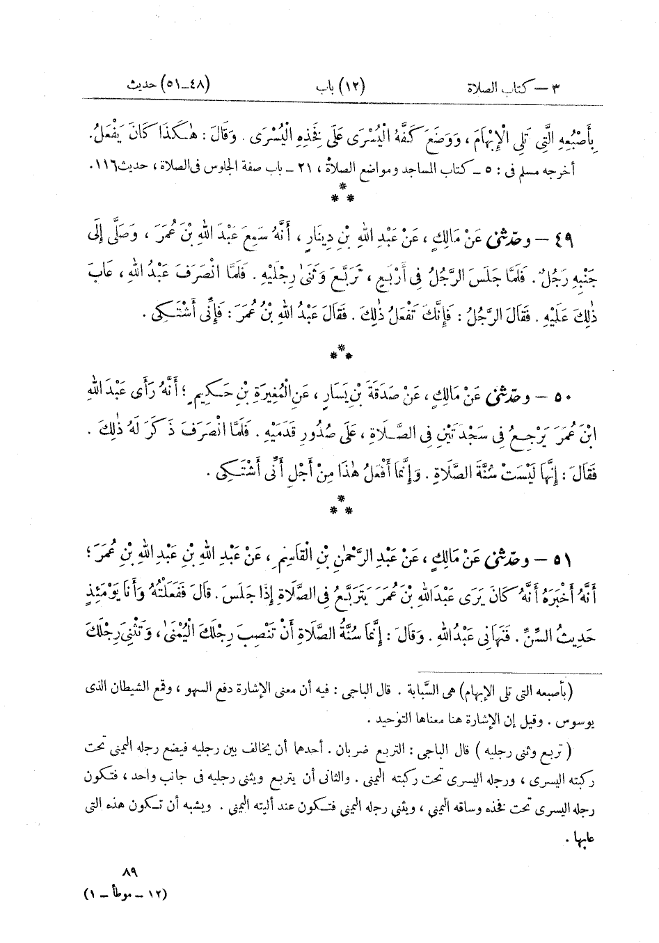 ٥٠ - وَحَدَّثَنِي عَنْ مَالِكٍ، عَنْ صَدَقَةَ بْنِ يَسَارٍ عَنِ الْمُغِيرَةِ بْنِ حَكِيمٍ أَنَّهُ رَأَى عَبْدَ اللَّهِ بْنَ عُمَرَ يَرْجِعُ فِي سَجْدَتَيْنِ فِي الصَّلَاةِ، عَلَى صُدُورِ قَدَمَيْهِ، فَلَمَّا انْصَرَفَ ذَكَرَ لَهُ ذَلِكَ. فَقَالَ: «إِنَّهَا لَيْسَتْ سُنَّةَ الصَّلَاةِ. وَإِنَّمَا أَفْعَلُ هَذَا مِنْ أَجْلِ أَنِّي أَشْتَكِي»