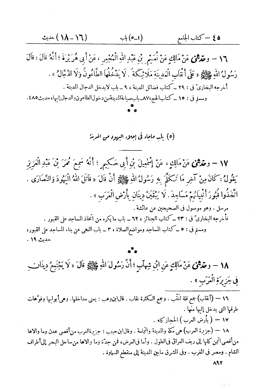 ١٧ - وَحَدَّثَنِي عَنْ مَالِكٍ، عَنْ إِسْمَاعِيلَ بْنِ أَبِي حَكِيمٍ، أَنَّهُ سَمِعَ عُمَرَ بْنَ عَبْدِ الْعَزِيزِ يَقُولُ: كَانَ مِنْ آخِرِ مَا تَكَلَّمَ بِهِ رَسُولُ اللَّهِ صَلَّى اللهُ عَلَيْهِ وَسَلَّمَ أَنْ قَالَ: «قَاتَلَ اللَّهُ الْيَهُودَ وَالنَّصَارَى اتَّخَذُوا قُبُورَ أَنْبِيَائِهِمْ مَسَاجِدَ، لَا يَبْقَيَنَّ دِينَانِ بِأَرْضِ الْعَرَبِ»