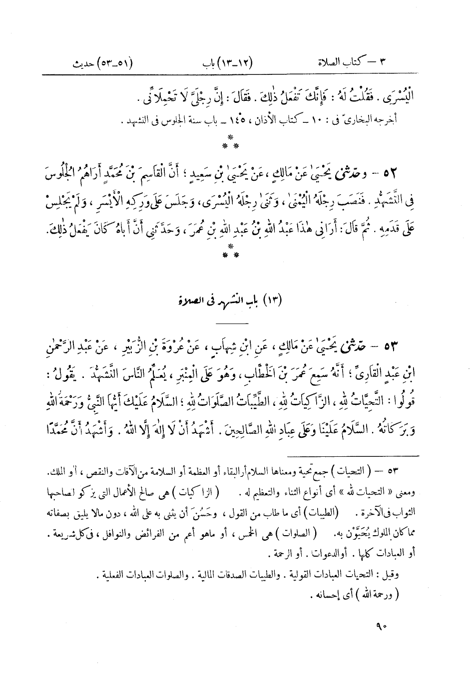 ٥٢ - وَحَدَّثَنِي يَحْيَى، عَنْ مَالِكٍ، عَنْ يَحْيَى بْنِ سَعِيدٍ، أَنَّ الْقَاسِمَ بْنَ مُحَمَّدٍ «أَرَاهُمُ الْجُلُوسَ فِي التَّشَهُّدِ، فَنَصَبَ رِجْلَهُ الْيُمْنَى، وَثَنَى رِجْلَهُ الْيُسْرَى، وَجَلَسَ عَلَى وَرِكِهِ الْأَيْسَرِ، وَلَمْ يَجْلِسْ عَلَى قَدَمِهِ». ثُمَّ قَالَ: أَرَانِي هَذَا عَبْدُ اللَّهِ بْنُ عَبْدِ اللَّهِ بْنِ عُمَرَ وَحَدَّثَنِي أَنَّ أَبَاهُ كَانَ يَفْعَلُ ذَلِكَ