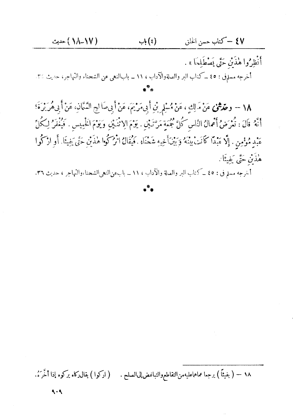 ١٨ - وَحَدَّثَنِي عَنْ مَالِكٍ، عَنْ مُسْلِمِ بْنِ أَبِي مَرْيَمَ، عَنْ أَبِي صَالِحٍ السَّمَّانِ، عَنْ أَبِي هُرَيْرَةَ، أَنَّهُ قَالَ: " تُعْرَضُ أَعْمَالُ النَّاسِ كُلَّ جُمُعَةٍ مَرَّتَيْنِ: يَوْمَ الْإِثْنَيْنِ وَيَوْمَ الْخَمِيسِ، فَيُغْفَرُ لِكُلِّ عَبْدٍ مُؤْمِنٍ، إِلَّا عَبْدًا كَانَتْ بَيْنَهُ وَبَيْنَ أَخِيهِ شَحْنَاءُ، فَيُقَالُ: اتْرُكُوا هَذَيْنِ حَتَّى يَفِيئَا، أَوِ ارْكُوا هَذَيْنِ حَتَّى يَفِيئَا """""""