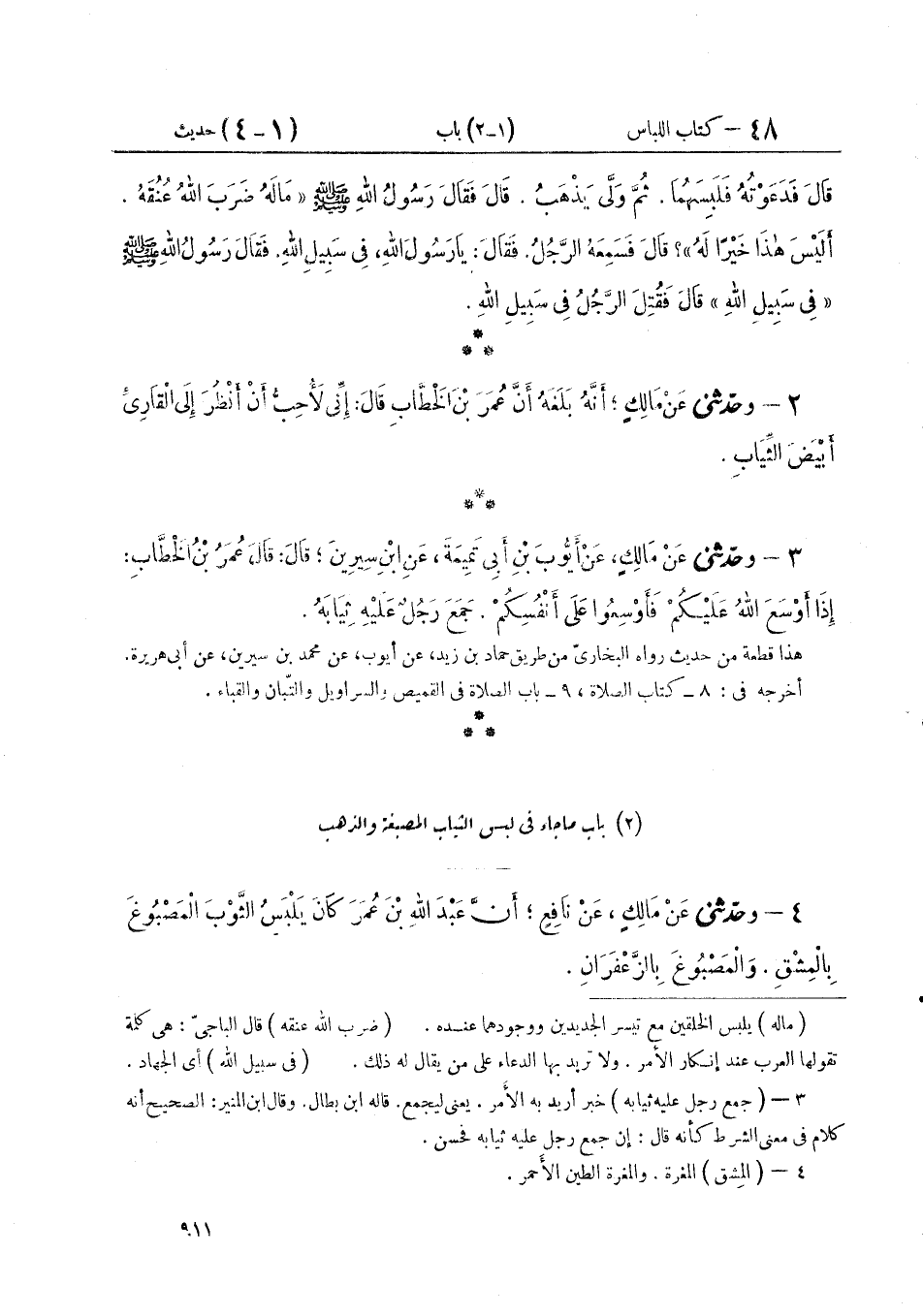 ٤ - وَحَدَّثَنِي عَنْ مَالِكٍ عَنْ نَافِعٍ، أَنَّ عَبْدَ اللَّهِ بْنَ عُمَرَ: «كَانَ يَلْبَسُ الثَّوْبَ الْمَصْبُوغَ بِالْمِشْقِ وَالْمَصْبُوغَ بِالزَّعْفَرَانِ» ⦗٩١٢⦘ قَالَ يَحْيَى: وَسَمِعْتُ مَالِكًا يَقُولُ: «وَأَنَا أَكْرَهُ أَنْ يَلْبَسَ الْغِلْمَانُ شَيْئًا مِنَ الذَّهَبِ، لِأَنَّهُ بَلَغَنِي» أَنَّ رَسُولَ اللَّهِ صَلَّى اللهُ عَلَيْهِ وَسَلَّمَ نَهَى عَنْ تَخَتُّمِ الذَّهَبِ، «فَأَنَا أَكْرَهُهُ لِلرِّجَالِ الْكَبِيرِ مِنْهُمْ وَالصَّغِيرِ» قَالَ يَحْيَى: وَسَمِعْتُ مَالِكًا يَقُولُ: " فِي الْمَلَاحِفِ الْمُعَصْفَرَةِ فِي الْبُيُوتِ لِلرِّجَالِ، وَفِي الْأَفْنِيَةِ قَالَ: لَا أَعْلَمُ مِنْ ذَلِكَ شَيْئًا حَرَامًا، وَغَيْرُ ذَلِكَ مِنَ اللِّبَاسِ أَحَبُّ إِلَيَّ "