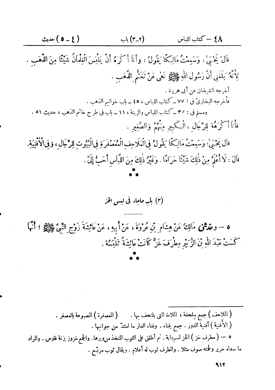 ٥ - وَحَدَّثَنِي مَالِكٌ، عَنْ هِشَامِ بْنِ عُرْوَةَ، عَنْ أَبِيهِ، عَنْ عَائِشَةَ، زَوْجِ النَّبِيِّ صَلَّى اللهُ عَلَيْهِ وَسَلَّمَ «أَنَّهَا كَسَتْ عَبْدَ اللَّهِ بْنَ الزُّبَيْرِ مِطْرَفَ خَزٍّ كَانَتْ عَائِشَةُ تَلْبَسُهُ»