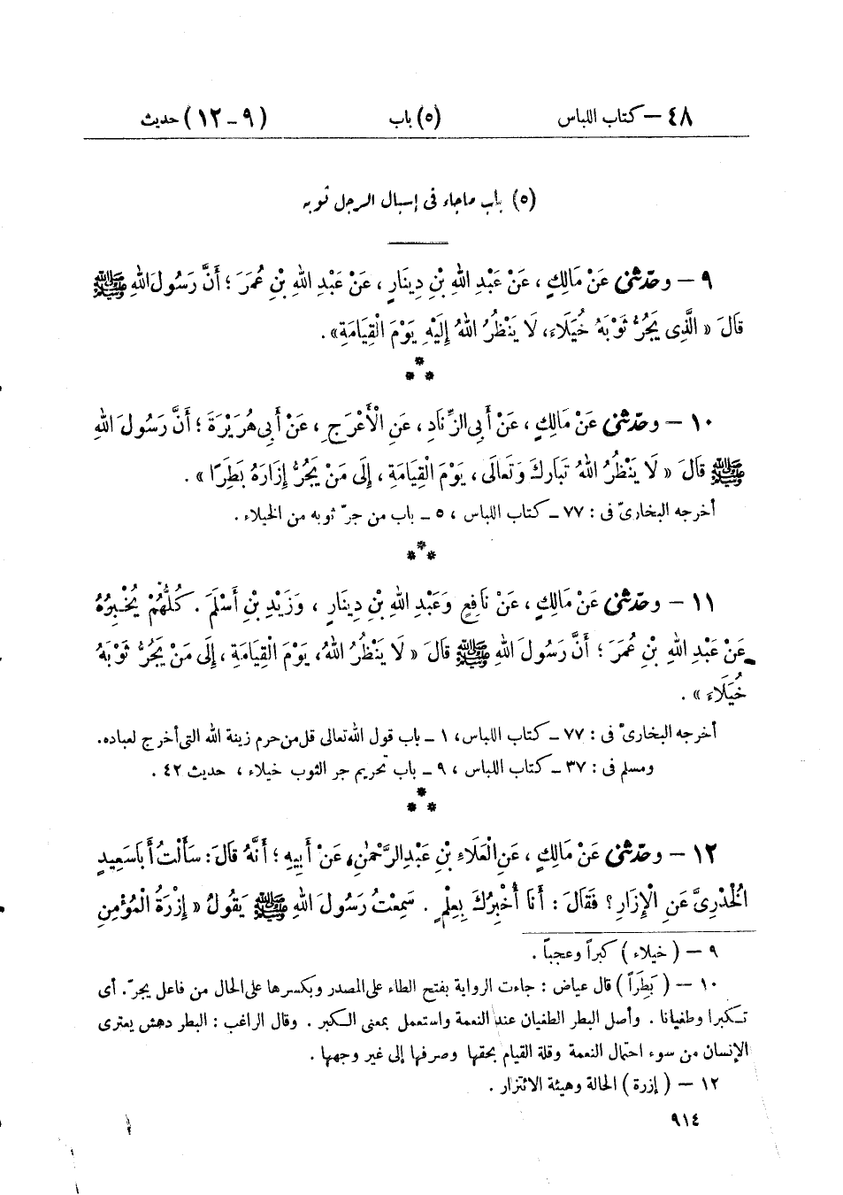 ٩ - وَحَدَّثَنِي عَنْ مَالِكٍ، عَنْ عَبْدِ اللَّهِ بْنِ دِينَارٍ، عَنْ عَبْدِ اللَّهِ بْنِ عُمَرَ، أَنَّ رَسُولَ اللَّهِ صَلَّى اللهُ عَلَيْهِ وَسَلَّمَ قَالَ: «الَّذِي يَجُرُّ ثَوْبَهُ خُيَلَاءَ، لَا يَنْظُرُ اللَّهُ إِلَيْهِ يَوْمَ الْقِيَامَةِ»
