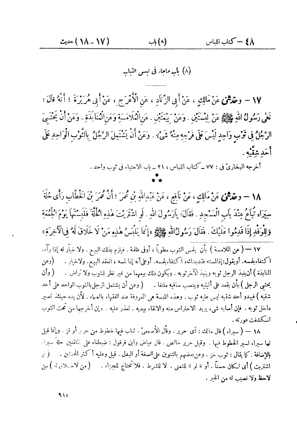 ١٧ - وَحَدَّثَنِي عَنْ مَالِكٍ، عَنْ أَبِي الزِّنَادِ، عَنِ الْأَعْرَجِ، عَنْ أَبِي هُرَيْرَةَ أَنَّهُ قَالَ: «نَهَى رَسُولُ اللَّهِ صَلَّى اللهُ عَلَيْهِ وَسَلَّمَ عَنْ لِبْسَتَيْنِ، وَعَنْ بَيْعَتَيْنِ، عَنِ الْمُلَامَسَةِ، وَعَنِ الْمُنَابَذَةِ، وَعَنْ أَنْ يَحْتَبِيَ الرَّجُلُ فِي ثَوْبٍ وَاحِدٍ، لَيْسَ عَلَى فَرْجِهِ مِنْهُ شَيْءٌ، وَعَنْ أَنْ يَشْتَمِلَ الرَّجُلُ بِالثَّوْبِ الْوَاحِدِ عَلَى أَحَدِ شِقَّيْهِ»