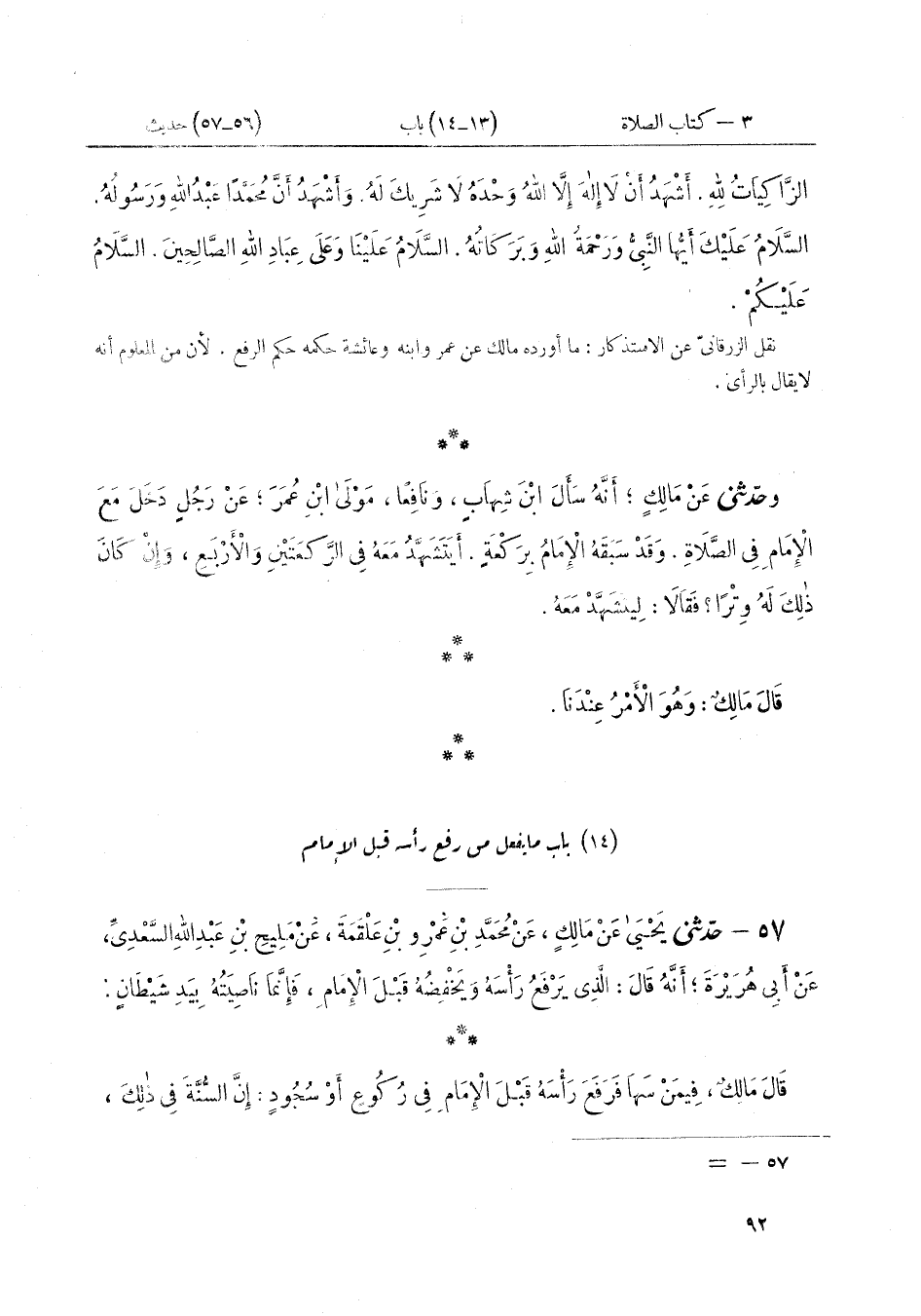 ٥٧ - حَدَّثَنِي يَحْيَى، عَنْ مَالِكٍ، عَنْ مُحَمَّدِ بْنِ عَمْرِو بْنِ عَلْقَمَةَ، عَنْ مَلِيحِ بْنِ عَبْدِ اللَّهِ السَّعْدِيِّ، عَنْ أَبِي هُرَيْرَةَ، أَنَّهُ قَالَ: «الَّذِي يَرْفَعُ رَأْسَهُ وَيَخْفِضُهُ قَبْلَ الْإِمَامِ، فَإِنَّمَا نَاصِيَتُهُ بِيَدِ شَيْطَانٍ»
