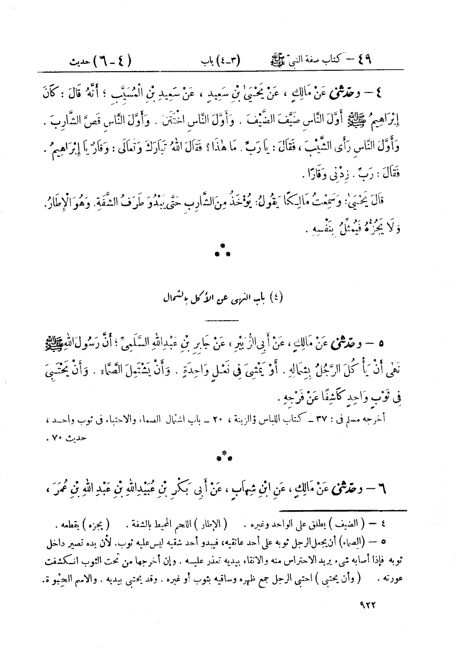 ٥ - وَحَدَّثَنِي عَنْ مَالِكٍ، عَنْ أَبِي الزُّبَيْرِ، عَنْ جَابِرِ بْنِ عَبْدِ اللَّهِ السَّلَمِيِّ، «أَنَّ رَسُولَ اللَّهِ صَلَّى اللهُ عَلَيْهِ وَسَلَّمَ نَهَى أَنْ يَأْكُلَ الرَّجُلُ بِشِمَالِهِ، أَوْ يَمْشِيَ فِي نَعْلٍ وَاحِدَةٍ، وَأَنْ يَشْتَمِلَ الصَّمَّاءَ، وَأَنْ يَحْتَبِيَ فِي ثَوْبٍ وَاحِدٍ كَاشِفًا عَنْ فَرْجِهِ»