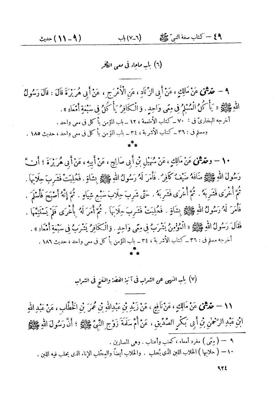 ٩ - حَدَّثَنِي عَنْ مَالِكٍ، عَنْ أَبِي الزِّنَادِ، عَنِ الْأَعْرَجِ، عَنْ أَبِي هُرَيْرَةَ قَالَ: قَالَ رَسُولُ اللَّهِ صَلَّى اللهُ عَلَيْهِ وَسَلَّمَ: «يَأْكُلُ الْمُسْلِمُ فِي مِعًى وَاحِدٍ، وَالْكَافِرُ يَأْكُلُ فِي سَبْعَةِ أَمْعَاءٍ»