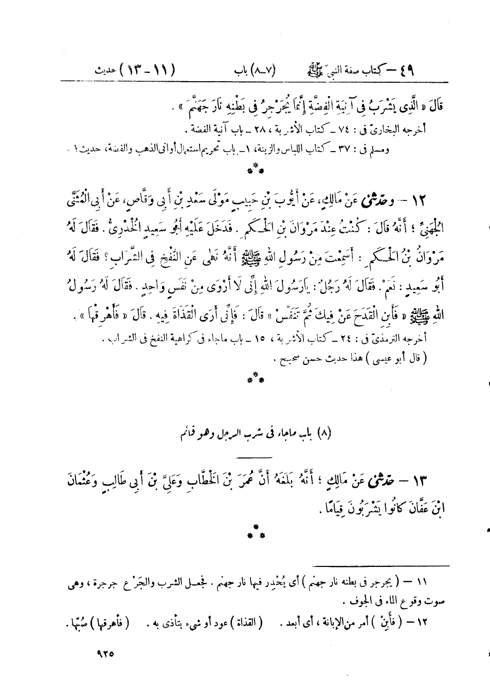 ١٣ - حَدَّثَنِي عَنْ مَالِكٍ أَنَّهُ بَلَغَهُ أَنَّ عُمَرَ بْنَ الْخَطَّابِ، وَعَلِيَّ بْنَ أَبِي طَالِبٍ، وَعُثْمَانَ بْنَ عَفَّانَ كَانُوا «يَشْرَبُونَ قِيَامًا»