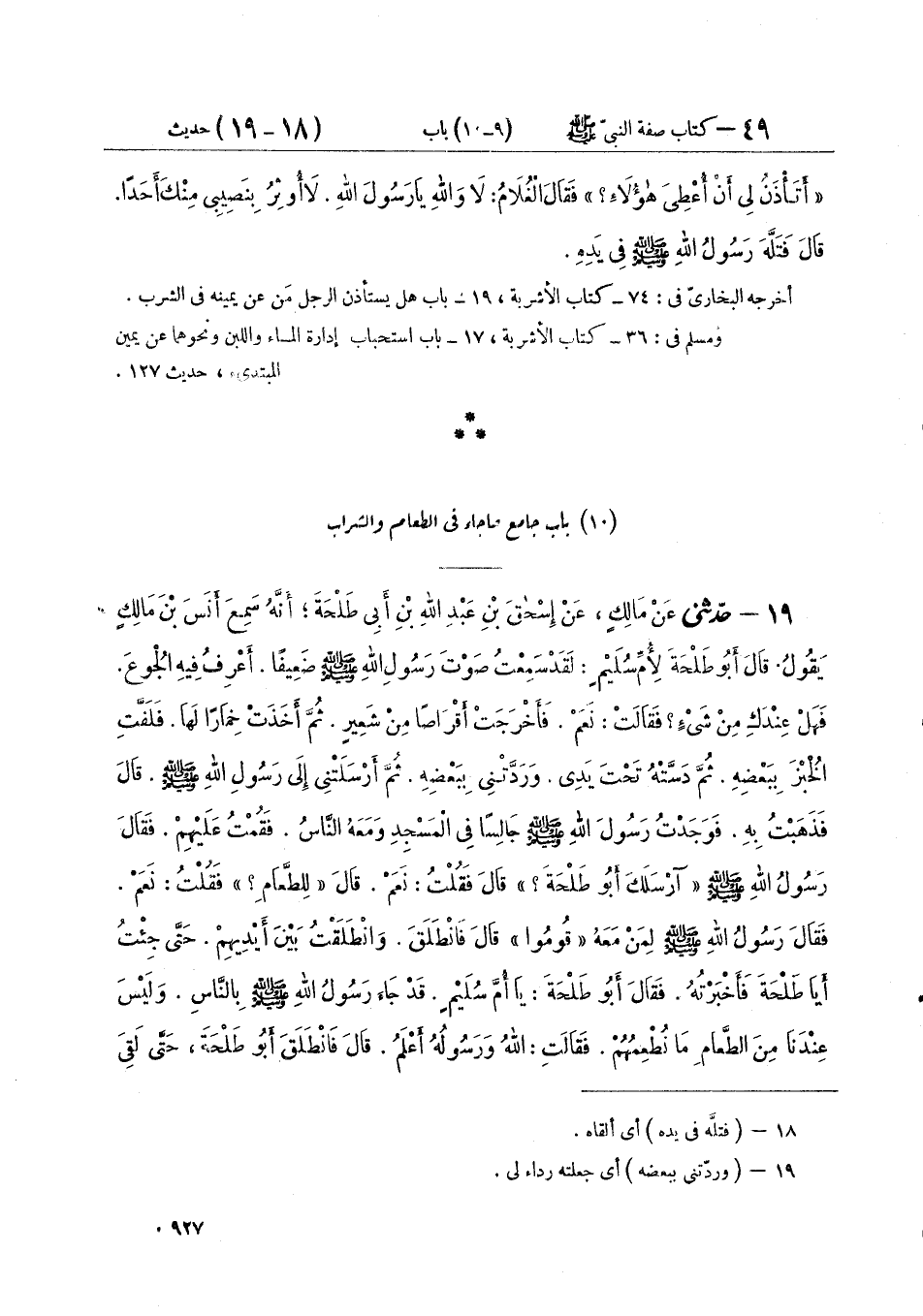 ١٩ - حَدَّثَنِي عَنْ مَالِكٍ، عَنْ إِسْحَقَ بْنِ عَبْدِ اللَّهِ بْنِ أَبِي طَلْحَةَ، أَنَّهُ سَمِعَ أَنَسَ بْنَ مَالِكٍ يَقُولُ: قَالَ أَبُو طَلْحَةَ لِأُمِّ سُلَيْمٍ: لَقَدْ سَمِعْتُ صَوْتَ رَسُولِ اللَّهِ صَلَّى اللهُ عَلَيْهِ وَسَلَّمَ ضَعِيفًا، أَعْرِفُ فِيهِ الْجُوعَ، فَهَلْ عِنْدَكِ مِنْ شَيْءٍ؟ فَقَالَتْ: نَعَمْ، فَأَخْرَجَتْ أَقْرَاصًا مِنْ شَعِيرٍ، ثُمَّ أَخَذَتْ خِمَارًا لَهَا، فَلَفَّتِ الْخُبْزَ بِبَعْضِهِ، ثُمَّ دَسَّتْهُ تَحْتَ يَدِي، وَرَدَّتْنِي بِبَعْضِهِ، ثُمَّ أَرْسَلَتْنِي إِلَى رَسُولِ اللَّهِ صَلَّى اللهُ عَلَيْهِ وَسَلَّمَ قَالَ: فَذَهَبْتُ بِهِ، فَوَجَدْتُ رَسُولَ اللَّهِ صَلَّى اللهُ عَلَيْهِ وَسَلَّمَ جَالِسًا فِي الْمَسْجِدِ، وَمَعَهُ النَّاسُ، فَقُمْتُ عَلَيْهِمْ، فَقَالَ رَسُولُ اللَّهِ صَلَّى اللهُ عَلَيْهِ وَسَلَّمَ: «آرْسَلَكَ أَبُو طَلْحَةَ؟» قَالَ فَقُلْتُ: نَعَمْ، قَالَ: «لِلطَّعَامِ؟» فَقُلْتُ: نَعَمْ، فَقَالَ رَسُولُ اللَّهِ صَلَّى اللهُ عَلَيْهِ وَسَلَّمَ لِمَنْ مَعَهُ، قُومُوا، قَالَ: فَانْطَلَقَ وَانْطَلَقْتُ بَيْنَ أَيْدِيهِمْ حَتَّى جِئْتُ أَبَا طَلْحَةَ فَأَخْبَرْتُهُ، فَقَالَ أَبُو طَلْحَةَ: يَا أُمَّ سُلَيْمٍ، قَدْ جَاءَ رَسُولُ اللَّهِ صَلَّى اللهُ عَلَيْهِ وَسَلَّمَ بِالنَّاسِ، وَلَيْسَ عِنْدَنَا مِنَ الطَّعَامِ مَا نُطْعِمُهُمْ، فَقَالَتِ: اللَّهُ وَرَسُولُهُ أَعْلَمُ، قَالَ: فَانْطَلَقَ أَبُو طَلْحَةَ حَتَّى لَقِيَ ⦗٩٢٨⦘ رَسُولَ اللَّهِ صَلَّى اللهُ عَلَيْهِ وَسَلَّمَ، فَأَقْبَلَ رَسُولُ اللَّهِ صَلَّى اللهُ عَلَيْهِ وَسَلَّمَ وَأَبُو طَلْحَةَ مَعَهُ، حَتَّى دَخَلَا فَقَالَ رَسُولُ اللَّهِ صَلَّى اللهُ عَلَيْهِ وَسَلَّمَ: «هَلُمِّي يَا أُمَّ سُلَيْمٍ مَا عِنْدَكِ؟» فَأَتَتْ بِذَلِكَ الْخُبْزِ، فَأَمَرَ بِهِ رَسُولُ اللَّهِ صَلَّى اللهُ عَلَيْهِ وَسَلَّمَ فَفُتَّ وَعَصَرَتْ عَلَيْهِ أُمُّ سُلَيْمٍ عُكَّةً لَهَا فَآدَمَتْهُ، ثُمَّ قَالَ رَسُولُ اللَّهِ صَلَّى اللهُ عَلَيْهِ وَسَلَّمَ: مَا شَاءَ اللَّهُ أَنْ يَقُولَ، ثُمَّ قَالَ: «ائْذَنْ لِعَشَرَةٍ بِالدُّخُولِ»، فَأَذِنَ لَهُمْ، فَأَكَلُوا حَتَّى شَبِعُوا، ثُمَّ خَرَجُوا، ثُمَّ قَالَ: «ائْذَنْ لِعَشَرَةٍ»، فَأَذِنَ لَهُمْ، فَأَكَلُوا حَتَّى شَبِعُوا، ثُمَّ خَرَجُوا، ثُمَّ قَالَ: «ائْذَنْ لِعَشَرَةٍ»، فَأَذِنَ لَهُمْ، فَأَكَلُوا حَتَّى شَبِعُوا ثُمَّ خَرَجُوا، ثُمَّ قَالَ: «ائْذَنْ لِعَشَرَةٍ»، فَأَذِنَ لَهُمْ، فَأَكَلُوا حَتَّى شَبِعُوا، ثُمَّ خَرَجُوا، ثُمَّ قَالَ: «ائْذَنْ لِعَشَرَةٍ» حَتَّى أَكَلَ الْقَوْمُ كُلُّهُمْ وَشَبِعُوا، وَالْقَوْمُ سَبْعُونَ رَجُلًا أَوْ ثَمَانُونَ رَجُلًا