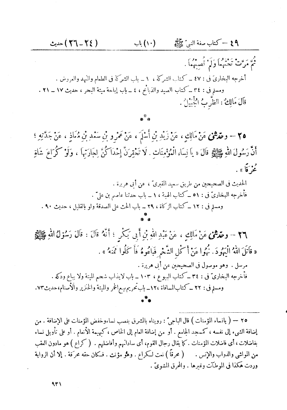 ٢٥ - وَحَدَّثَنِي عَنْ مَالِكٍ، عَنْ زَيْدِ بْنِ أَسْلَمَ، عَنْ عَمْرِو بْنِ سَعْدِ بْنِ مُعَاذٍ، عَنْ جَدَّتِهِ، أَنَّ رَسُولَ اللَّهِ صَلَّى اللهُ عَلَيْهِ وَسَلَّمَ قَالَ: «يَا نِسَاءَ الْمُؤْمِنَاتِ، لَا تَحْقِرَنَّ إِحْدَاكُنَّ لِجَارَتِهَا، وَلَوْ كُرَاعَ شَاةٍ مُحْرَقًا»