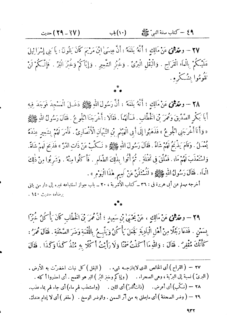 ٢٩ - وَحَدَّثَنِي عَنْ مَالِكٍ، عَنْ يَحْيَى بْنِ سَعِيدٍ، أَنَّ عُمَرَ بْنَ الْخَطَّابِ، كَانَ يَأْكُلُ خُبْزًا بِسَمْنٍ، فَدَعَا رَجُلًا مِنْ أَهْلِ الْبَادِيَةِ فَجَعَلَ يَأْكُلُ وَيَتَّبِعُ بِاللُّقْمَةِ وَضَرَ الصَّحْفَةِ، فَقَالَ عُمَرُ: «كَأَنَّكَ مُقْفِرٌ»، فَقَالَ: وَاللَّهِ مَا أَكَلْتُ سَمْنًا، وَلَا رَأَيْتُ أكْلًا بِهِ مُنْذُ كَذَا وَكَذَا، فَقَالَ ⦗٩٣٣⦘ عُمَرُ: «لَا آكُلُ السَّمْنَ حَتَّى يَحْيَا النَّاسُ مِنْ أَوَّلِ مَا يَحْيَوْنَ»