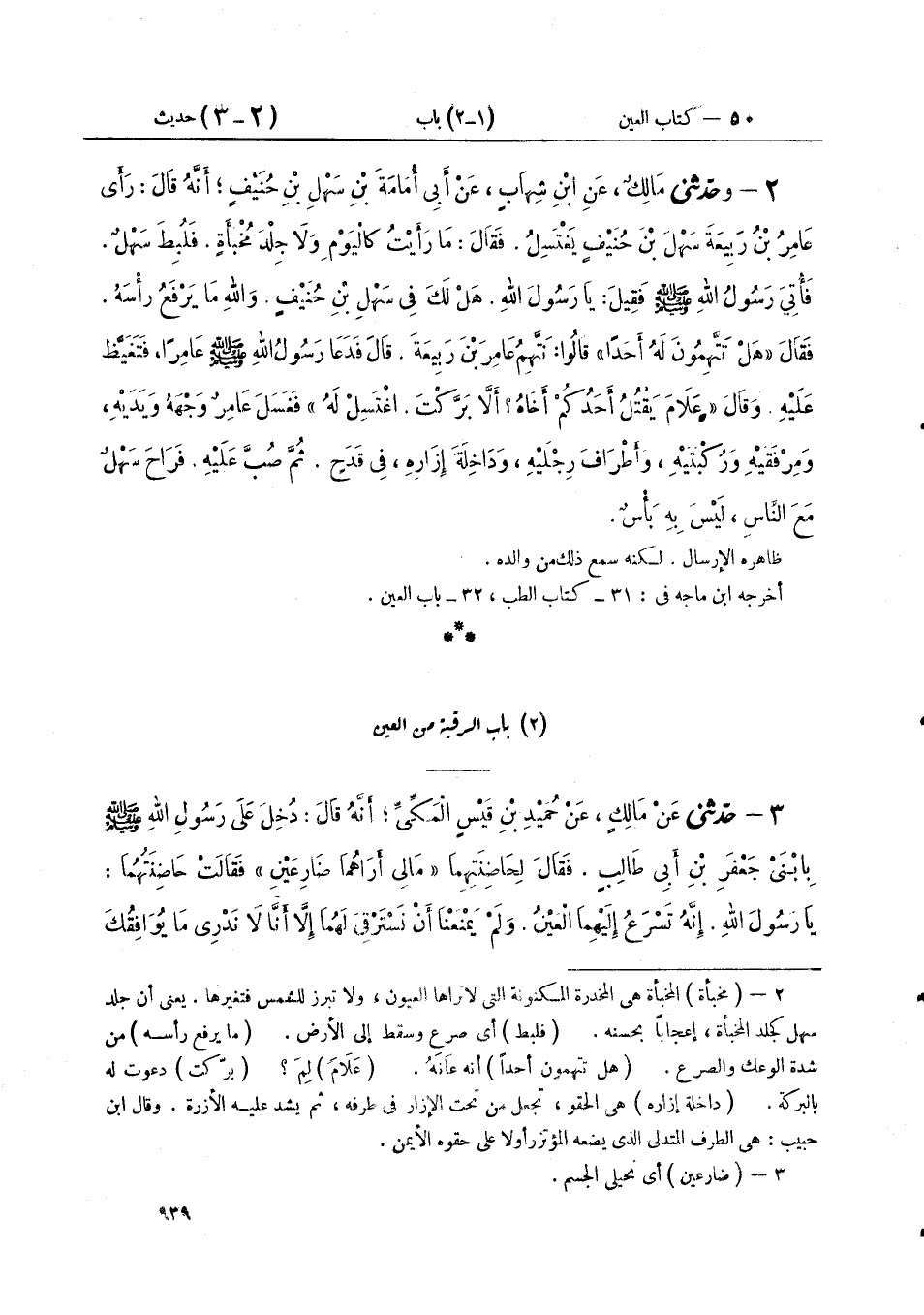 ٢ - وَحَدَّثَنِي مَالِكٌ، عَنِ ابْنِ شِهَابٍ، عَنْ أَبِي أُمَامَةَ بْنِ سَهْلِ بْنِ حُنَيْفٍ، أَنَّهُ قَالَ: رَأَى عَامِرُ بْنُ رَبِيعَةَ سَهْلَ بْنَ حُنَيْفٍ يَغْتَسِلُ، فَقَالَ: مَا رَأَيْتُ كَالْيَوْمِ وَلَا جِلْدَ مُخْبَأَةٍ، فَلُبِطَ سَهْلٌ، فَأُتِيَ رَسُولُ اللَّهِ صَلَّى اللهُ عَلَيْهِ وَسَلَّمَ، فَقِيلَ: يَا رَسُولَ اللَّهِ، هَلْ لَكَ فِي سَهْلِ بْنِ حُنَيْفٍ؟ وَاللَّهِ مَا يَرْفَعُ رَأْسَهُ، فَقَالَ: «هَلْ تَتَّهِمُونَ لَهُ أَحَدًا؟» قَالُوا: نَتَّهِمُ عَامِرَ بْنَ رَبِيعَةَ، قَالَ: فَدَعَا رَسُولُ اللَّهِ صَلَّى اللهُ عَلَيْهِ وَسَلَّمَ عَامِرًا فَتَغَيَّظَ عَلَيْهِ، وَقَالَ: «عَلَامَ يَقْتُلُ أَحَدُكُمْ أَخَاهُ، أَلَّا بَرَّكْتَ اغْتَسِلْ لَهُ»، فَغَسَلَ عَامِرٌ وَجْهَهُ وَيَدَيْهِ، وَمِرْفَقَيْهِ وَرُكْبَتَيْهِ، وَأَطْرَافَ رِجْلَيْهِ وَدَاخِلَةَ إِزَارِهِ فِي قَدَحٍ، ثُمَّ صُبَّ عَلَيْهِ، فَرَاحَ سَهْلٌ مَعَ النَّاسِ لَيْسَ بِهِ بَأْسٌ