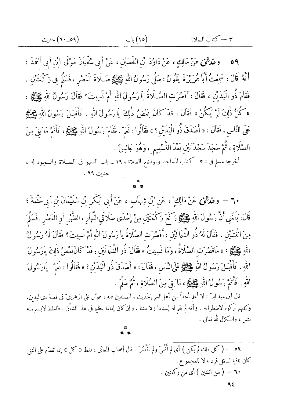 ٥٩ - وَحَدَّثَنِي عَنْ مَالِكٍ، عَنْ دَاوُدَ بْنِ الْحُصَيْنِ، عَنْ أَبِي سُفْيَانَ مَوْلَى ابْنِ أَبِي أَحْمَدَ أَنَّهُ قَالَ: سَمِعْتُ أَبَا هُرَيْرَةَ يَقُولُ: صَلَّى رَسُولُ اللَّهِ صَلَّى اللهُ عَلَيْهِ وَسَلَّمَ صَلَاةَ الْعَصْرِ، فَسَلَّمَ فِي رَكْعَتَيْنِ. فَقَامَ ذُو الْيَدَيْنِ فَقَالَ: أَقَصُرَتِ الصَّلَاةُ يَا رَسُولَ اللَّهِ أَمْ نَسِيتَ؟ فَقَالَ رَسُولُ اللَّهِ صَلَّى اللهُ عَلَيْهِ وَسَلَّمَ: «كُلُّ ذَلِكَ لَمْ يَكُنْ»، فَقَالَ: قَدْ كَانَ بَعْضُ ذَلِكَ يَا رَسُولَ اللَّهِ فَأَقْبَلَ رَسُولُ اللَّهِ صَلَّى اللهُ عَلَيْهِ وَسَلَّمَ عَلَى النَّاسِ فَقَالَ: «أَصَدَقَ ذُو الْيَدَيْنِ؟» فَقَالُوا: نَعَمْ. فَقَامَ رَسُولُ اللَّهِ صَلَّى اللهُ عَلَيْهِ وَسَلَّمَ فَأَتَمَّ مَا بَقِيَ مِنَ الصَّلَاةِ، ثُمَّ سَجَدَ سَجْدَتَيْنِ بَعْدَ التَّسْلِيمِ، وَهُوَ جَالِسٌ