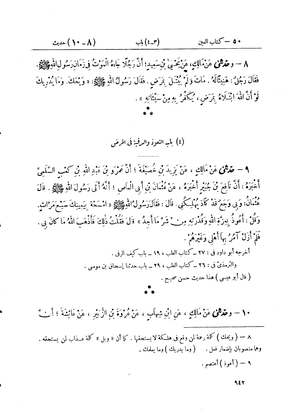 ١٠ - وحَدَّثَنِي عَنْ مَالِكٍ، عَنِ ابْنِ شِهَابٍ، عَنْ عُرْوَةَ بْنِ الزُّبَيْرِ، عَنْ عَائِشَةَ، أَنَّ ⦗٩٤٣⦘ رَسُولَ اللَّهِ صَلَّى اللهُ عَلَيْهِ وَسَلَّمَ كَانَ «إِذَا اشْتَكَى يَقْرَأُ عَلَى نَفْسِهِ بِالْمُعَوِّذَاتِ وَيَنْفِثُ»، قَالَتْ: «فَلَمَّا اشْتَدَّ وَجَعُهُ، كُنْتُ أَنَا أَقْرَأُ عَلَيْهِ، وَأَمْسَحُ عَلَيْهِ بِيَمِينِهِ رَجَاءَ بَرَكَتِهَا»