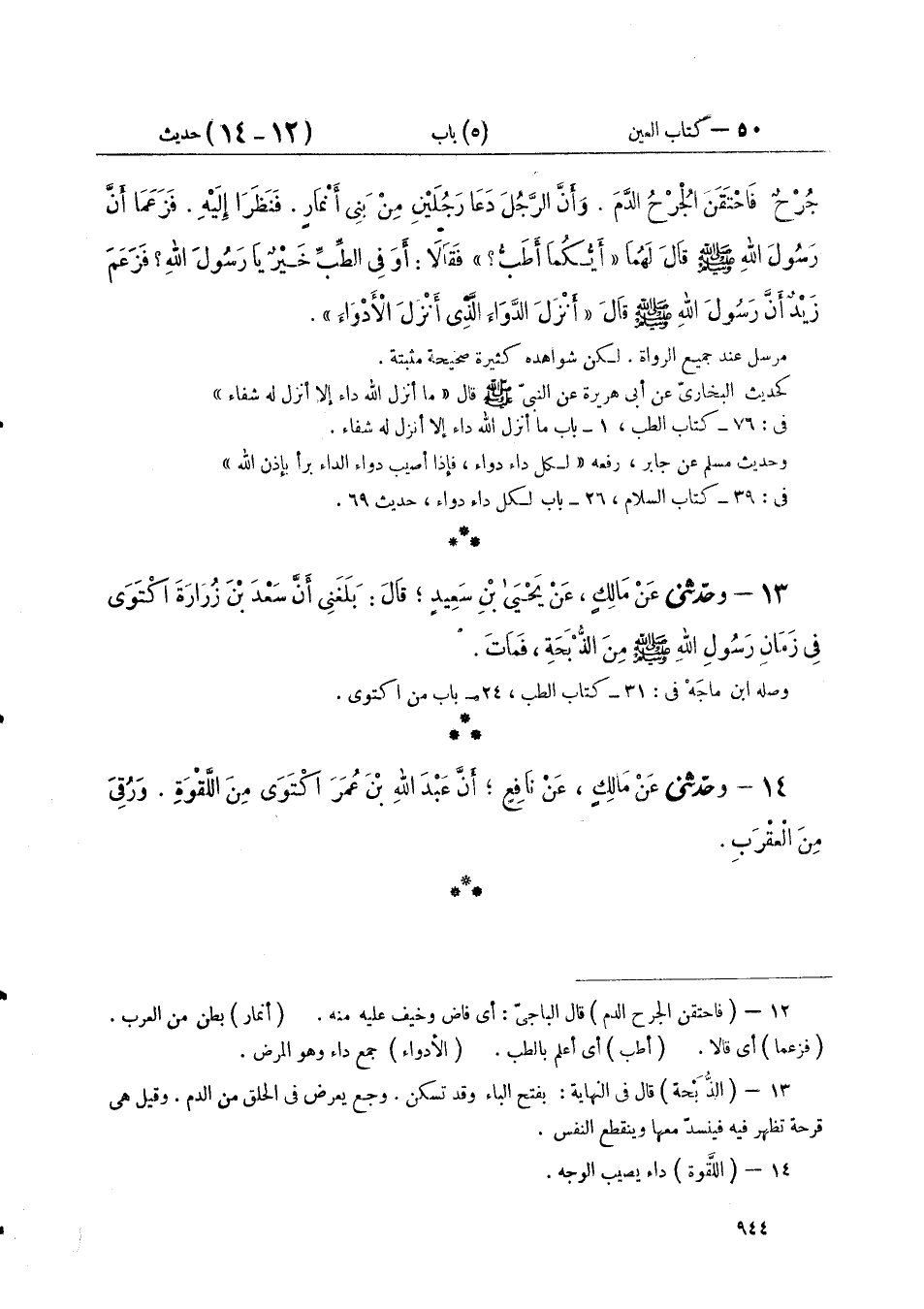 ١٣ - وَحَدَّثَنِي عَنْ مَالِكٍ، عَنْ يَحْيَى بْنِ سَعِيدٍ قَالَ: بَلَغَنِي «أَنَّ سَعْدَ بْنَ زُرَارَةَ، اكْتَوَى فِي زَمَانِ رَسُولِ اللَّهِ صَلَّى اللهُ عَلَيْهِ وَسَلَّمَ مِنَ الذُّبْحَةِ فَمَاتَ»