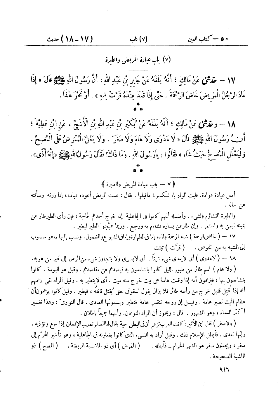 ١٨ - وَحَدَّثَنِي عَنْ مَالِكٍ أَنَّهُ بَلَغَهُ عَنْ بُكَيْرِ بْنِ عَبْدِ اللَّهِ بْنِ الْأَشَجِّ، عَنْ أَبِي عَطِيَّةَ الأَشْجَعِيِّ، أَنَّ رَسُولَ اللَّهِ صَلَّى اللهُ عَلَيْهِ وَسَلَّمَ قَالَ: «لَا عَدْوَى، وَلَا هَامَ، وَلَا صَفَرَ، وَلَا يَحُلَّ الْمُمْرِضُ عَلَى الْمُصِحِّ، وَلْيَحْلُلِ الْمُصِحُّ حَيْثُ شَاءَ»، فَقَالُوا: يَا رَسُولَ اللَّهِ، وَمَا ذَاكَ؟ فَقَالَ رَسُولُ اللَّهِ صَلَّى اللهُ عَلَيْهِ وَسَلَّمَ: «إِنَّهُ أَذًى»