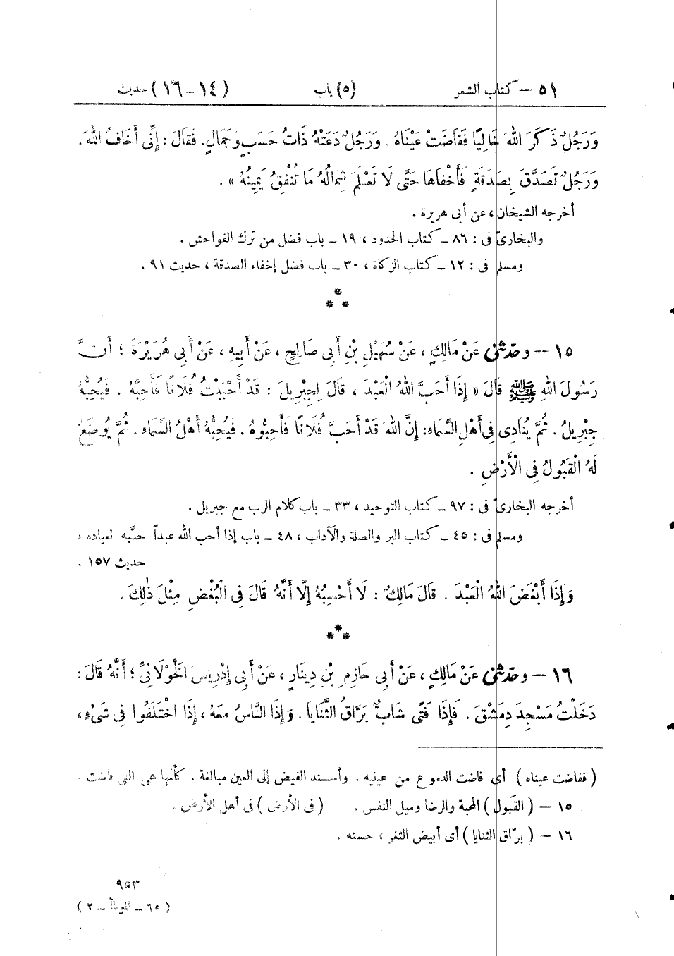 ١٦ - وَحَدَّثَنِي عَنْ مَالِكٍ، عَنْ أَبِي حَازِمِ بْنِ دِينَارٍ، عَنْ أَبِي إِدْرِيسَ الْخَوْلَانِيِّ، أَنَّهُ قَالَ: دَخَلْتُ مَسْجِدَ دِمَشْقَ فَإِذَا فَتًى شَابٌّ بَرَّاقُ الثَّنَايَا، وَإِذَا النَّاسُ مَعَهُ إِذَا اخْتَلَفُوا فِي شَيْءٍ ⦗٩٥٤⦘ أَسْنَدُوا إِلَيْهِ، وَصَدَرُوا عَنْ قَوْلِهِ، فَسَأَلْتُ عَنْهُ، فَقِيلَ هَذَا مُعَاذُ بْنُ جَبَلٍ، فَلَمَّا كَانَ الْغَدُ هَجَّرْتُ فَوَجَدْتُهُ قَدْ سَبَقَنِي بِالتَّهْجِيرِ، وَوَجَدْتُهُ يُصَلِّي، قَالَ: فَانْتَظَرْتُهُ حَتَّى قَضَى صَلَاتَهُ، ثُمَّ جِئْتُهُ مِنْ قِبَلِ وَجْهِهِ، فَسَلَّمْتُ عَلَيْهِ، ثُمَّ قُلْتُ: وَاللَّهِ إِنِّي لَأُحِبُّكَ لِلَّهِ، فَقَالَ: أَاللَّهِ؟ فَقُلْتُ: أَاللَّهِ، فَقَالَ: أَاللَّهِ؟ فَقُلْتُ: أَاللَّهِ، فَقَالَ: أَاللَّهِ؟ فَقُلْتُ: أَاللَّهِ. قَالَ: فَأَخَذَ بِحُبْوَةِ رِدَائِي فَجَبَذَنِي إِلَيْهِ، وَقَالَ: أَبْشِرْ فَإِنِّي سَمِعْتُ رَسُولَ اللَّهِ صَلَّى اللهُ عَلَيْهِ وَسَلَّمَ يَقُولُ: " قَالَ اللَّهُ تَبَارَكَ وَتَعَالَى: وَجَبَتْ مَحَبَّتِي لِلْمُتَحَابِّينَ فِيَّ، وَالْمُتَجَالِسِينَ فِيَّ، وَالْمُتَزَاوِرِينَ فِيَّ، وَالْمُتَبَاذِلِينَ فِيَّ "
