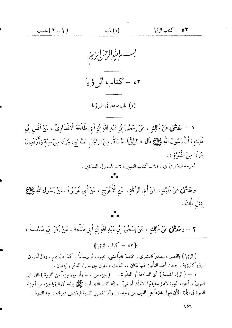 ١ - حَدَّثَنِي عَنْ مَالِكٍ، عَنْ إِسْحَاقَ بْنِ عَبْدِ اللَّهِ بْنِ أَبِي طَلْحَةَ الْأَنْصَارِيِّ، عَنْ أَنَسِ بْنِ مَالِكٍ، أَنَّ رَسُولَ اللَّهِ صَلَّى اللهُ عَلَيْهِ وَسَلَّمَ قَالَ: «الرُّؤْيَا الْحَسَنَةُ مِنَ الرَّجُلِ الصَّالِحِ جُزْءٌ مِنْ سِتَّةٍ وَأَرْبَعِينَ جُزْءًا مِنَ النُّبُوَّةِ»، وَحَدَّثَنِي عَنْ مالِكٍ، عَنْ أَبِي الزِّنَادِ، عَنِ الْأَعْرَجِ، عَنْ أَبِي هُرَيْرَةَ، عَنْ رَسُولِ اللَّهِ صَلَّى اللهُ عَلَيْهِ وَسَلَّمَ بِمِثْلِ ذَلِكَ