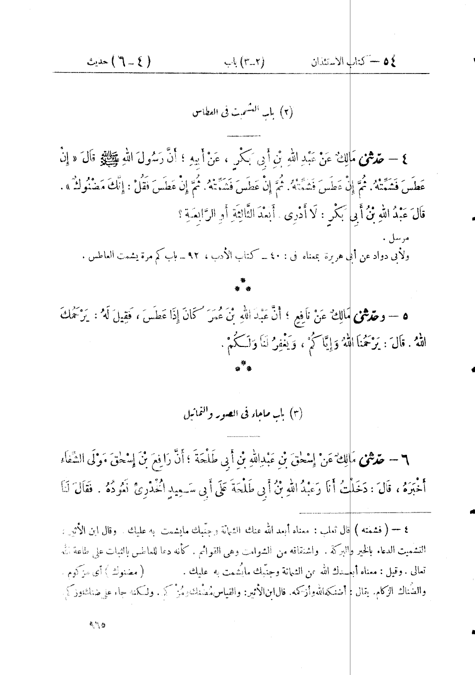 ٤ - حَدَّثَنِي مَالِكٌ، عَنْ عَبْدِ اللَّهِ بْنِ أَبِي بَكْرٍ، عَنْ أَبِيهِ، أَنَّ رَسُولَ اللَّهِ صَلَّى اللهُ عَلَيْهِ وَسَلَّمَ قَالَ: " إِنْ عَطَسَ فَشَمِّتْهُ، ثُمَّ إِنْ عَطَسَ فَشَمِّتْهُ، ثُمَّ إِنْ عَطَسَ فَشَمِّتْهُ، ثُمَّ إِنْ عَطَسَ فَقُلْ: إِنَّكَ مَضْنُوكٌ " قَالَ عَبْدُ اللَّهِ بْنُ أَبِي بَكْرٍ لَا أَدْرِي أَبَعْدَ الثَّالِثَةِ أَوِ الرَّابِعَةِ