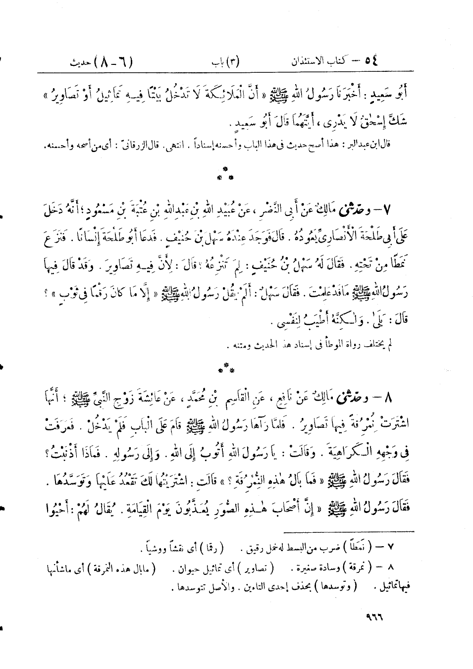 ٧ - وَحَدَّثَنِي مَالِكٌ، عَنْ أَبِي النَّضْرِ، عَنْ عُبَيْدِ اللَّهِ بْنِ عَبْدِ اللَّهِ بْنِ عُتْبَةَ بْنِ مَسْعُودٍ، أَنَّهُ دَخَلَ عَلَى أَبِي طَلْحَةَ الْأَنْصَارِيِّ يَعُودُهُ، قَالَ: فَوَجَدَ عِنْدَهُ سَهْلَ بْنَ حُنَيْفٍ فَدَعَا أَبُو طَلْحَةَ إِنْسَانًا، فَنَزَعَ نَمَطًا مِنْ تَحْتِهِ، فَقَالَ لَهُ سَهْلُ بْنُ حُنَيْفٍ: لِمَ تَنْزِعُهُ؟ قَالَ: لِأَنَّ فِيهِ تَصَاوِيرَ، وَقَدْ قَالَ فِيهَا رَسُولُ اللَّهِ صَلَّى اللهُ عَلَيْهِ وَسَلَّمَ مَا قَدْ عَلِمْتَ، فَقَالَ سَهْلٌ: أَلَمْ يَقُلْ رَسُولُ اللَّهِ صَلَّى اللهُ عَلَيْهِ وَسَلَّمَ «إِلَّا مَا كَانَ رَقْمًا فِي ثَوْبٍ»، قَالَ: بَلَى، وَلَكِنَّهُ أَطْيَبُ لِنَفْسِي