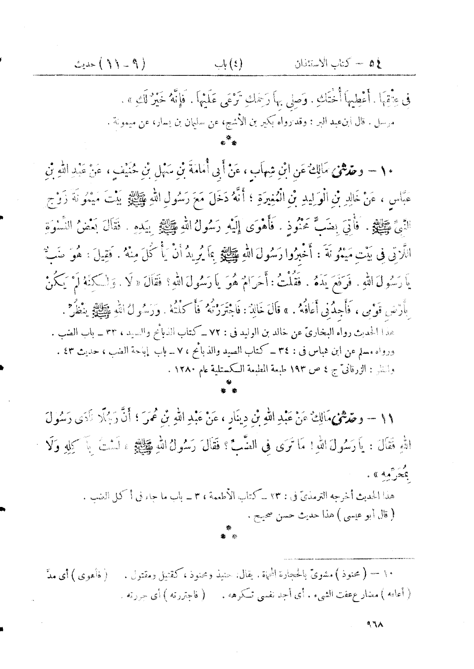١٠ - وَحَدَّثَنِي مَالِكٌ، عَنِ ابْنِ شِهَابٍ، عَنْ أَبِي أُمَامَةَ بْنِ سَهْلِ بْنِ حُنَيْفٍ، عَنْ عَبْدِ اللَّهِ بْنِ عَبَّاسٍ، عَنْ خَالِدِ بْنِ الْوَلِيدِ بْنِ الْمُغِيرَةِ، أَنَّهُ دَخَلَ مَعَ رَسُولِ اللَّهِ صَلَّى اللهُ عَلَيْهِ وَسَلَّمَ بَيْتَ مَيْمُونَةَ زَوْجِ النَّبِيِّ صَلَّى اللهُ عَلَيْهِ وَسَلَّمَ فَأُتِيَ بِضَبٍّ مَحْنُوذٍ، فَأَهْوَى إِلَيْهِ رَسُولُ اللَّهِ صَلَّى اللهُ عَلَيْهِ وَسَلَّمَ بِيَدِهِ، فَقَالَ بَعْضُ النِّسْوَةِ اللَّاتِي فِي بَيْتِ مَيْمُونَةَ: أَخْبِرُوا رَسُولَ اللَّهِ صَلَّى اللهُ عَلَيْهِ وَسَلَّمَ بِمَا يُرِيدُ أَنْ يَأْكُلَ مِنْهُ؟ فَقِيلَ: هُوَ ضَبٌّ يَا رَسُولَ اللَّهِ، فَرَفَعَ يَدَهُ، فَقُلْتُ: أَحَرَامٌ هُوَ يَا رَسُولَ اللَّهِ؟ فَقَالَ: «لَا، وَلَكِنَّهُ لَمْ يَكُنْ بِأَرْضِ قَوْمِي، فَأَجِدُنِي أَعَافُهُ» قَالَ خَالِدٌ: فَاجْتَرَرْتُهُ فَأَكَلْتُهُ، وَرَسُولُ اللَّهِ صَلَّى اللهُ عَلَيْهِ وَسَلَّمَ يَنْظُرُ
