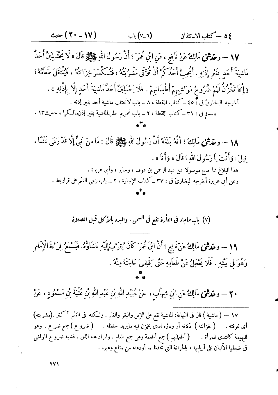 ١٧ - وَحَدَّثَنِي مَالِكٌ، عَنْ نَافِعٍ، عَنْ ابْنِ عُمَرَ، أَنَّ رَسُولَ اللَّهِ صَلَّى اللهُ عَلَيْهِ وَسَلَّمَ قَالَ: «لَا يَحْتَلِبَنَّ أَحَدٌ مَاشِيَةَ أَحَدٍ بِغَيْرِ إِذْنِهِ، أَيُحِبُّ أَحَدُكُمْ أَنْ تُؤْتَى مَشْرُبَتُهُ، فَتُكْسَرَ خِزَانَتُهُ فَيُنْتَقَلَ طَعَامُهُ، وَإِنَّمَا تَخْزُنُ لَهُمْ ضُرُوعُ مَوَاشِيهِمْ أَطْعِمَاتِهِمْ، فَلَا يَحْتَلِبَنَّ أَحَدٌ مَاشِيَةَ أَحَدٍ إِلَّا بِإِذْنِهِ»