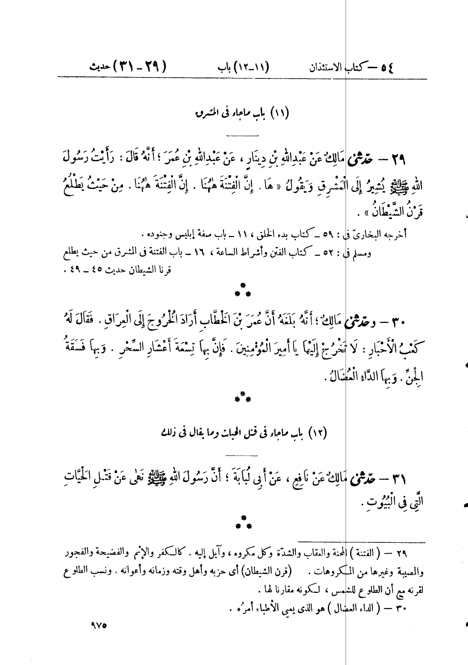 ٢٩ - حَدَّثَنِي مالِكٍ، عَنْ عَبْدِ اللَّهِ بْنِ دِينَارٍ، عَنْ عَبْدِ اللَّهِ بْنِ عُمَرَ، أَنَّهُ قَالَ: رَأَيْتُ رَسُولَ اللَّهِ صَلَّى اللهُ عَلَيْهِ وَسَلَّمَ يُشِيرُ إِلَى الْمَشْرِقِ وَيَقُولُ: «هَا إِنَّ الْفِتْنَةَ هَاهُنَا، إِنَّ الْفِتْنَةَ هَاهُنَا، مِنْ حَيْثُ يَطْلُعُ قَرْنُ الشَّيْطَانِ»