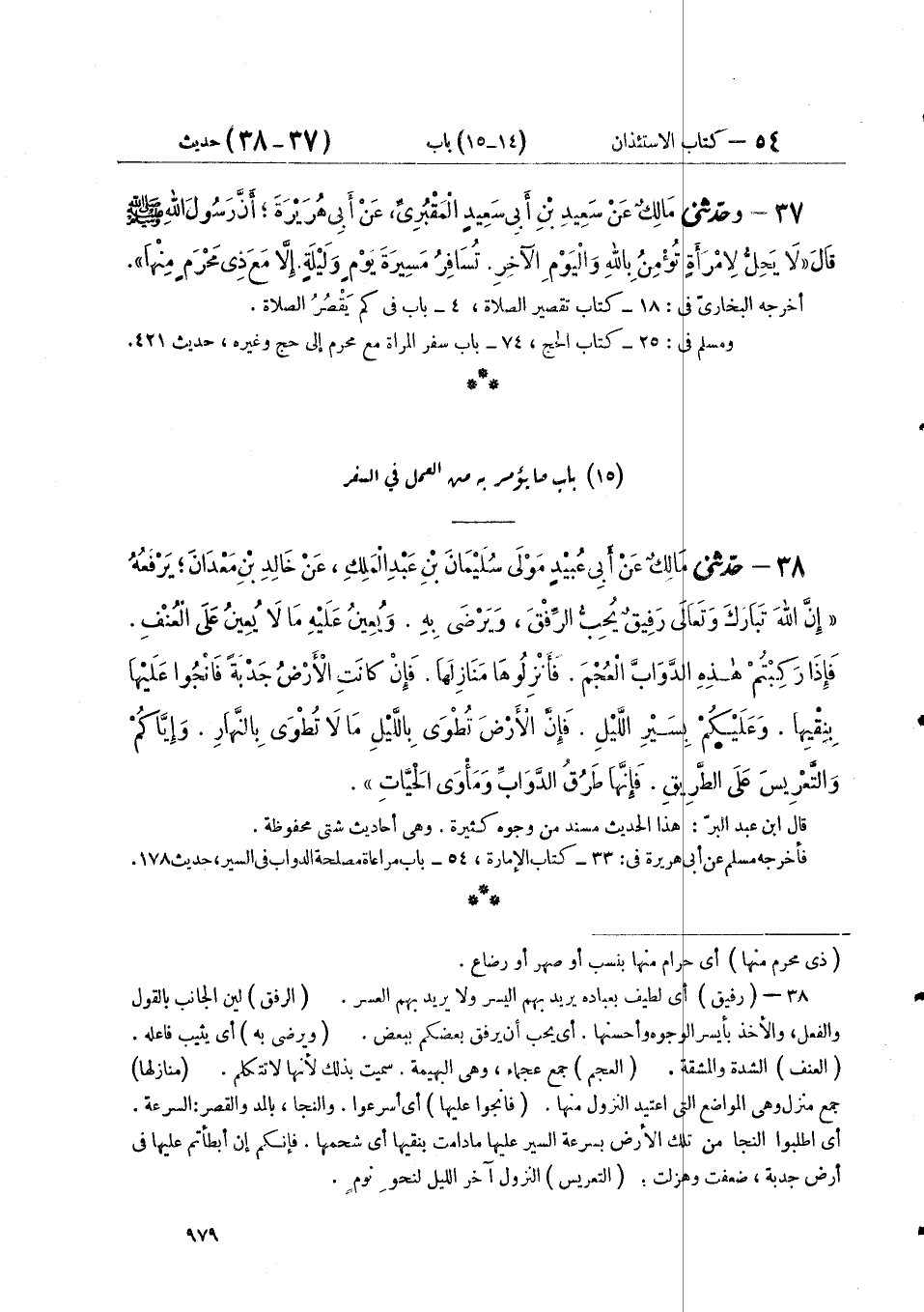 ٣٨ - حَدَّثَنِي مَالِكٌ، عَنْ أَبِي عُبَيْدٍ، مَوْلَى سُلَيْمَانَ بْنِ عَبْدِ الْمَلِكِ، عَنْ خَالِدِ بْنِ مَعْدَانَ يَرْفَعُهُ، «إِنَّ اللَّهَ تَبَارَكَ وَتَعَالَى رَفِيقٌ يُحِبُّ الرِّفْقَ، وَيَرْضَى بِهِ، وَيُعِينُ عَلَيْهِ مَا لَا يُعِينُ عَلَى الْعُنْفِ، فَإِذَا رَكِبْتُمْ هَذِهِ الدَّوَابَّ الْعُجْمَ فَأَنْزِلُوهَا مَنَازِلَهَا، فَإِنْ كَانَتِ الْأَرْضُ جَدْبَةً فَانْجُوا عَلَيْهَا بِنِقْيِهَا، وَعَلَيْكُمْ بِسَيْرِ اللَّيْلِ، فَإِنَّ الْأَرْضَ تُطْوَى بِاللَّيْلِ، مَا لَا تُطْوَى بِالنَّهَارِ، وَإِيَّاكُمْ وَالتَّعْرِيسَ عَلَى الطَّرِيقِ، فَإِنَّهَا طُرُقُ الدَّوَابِّ، وَمَأْوَى الْحَيَّاتِ»