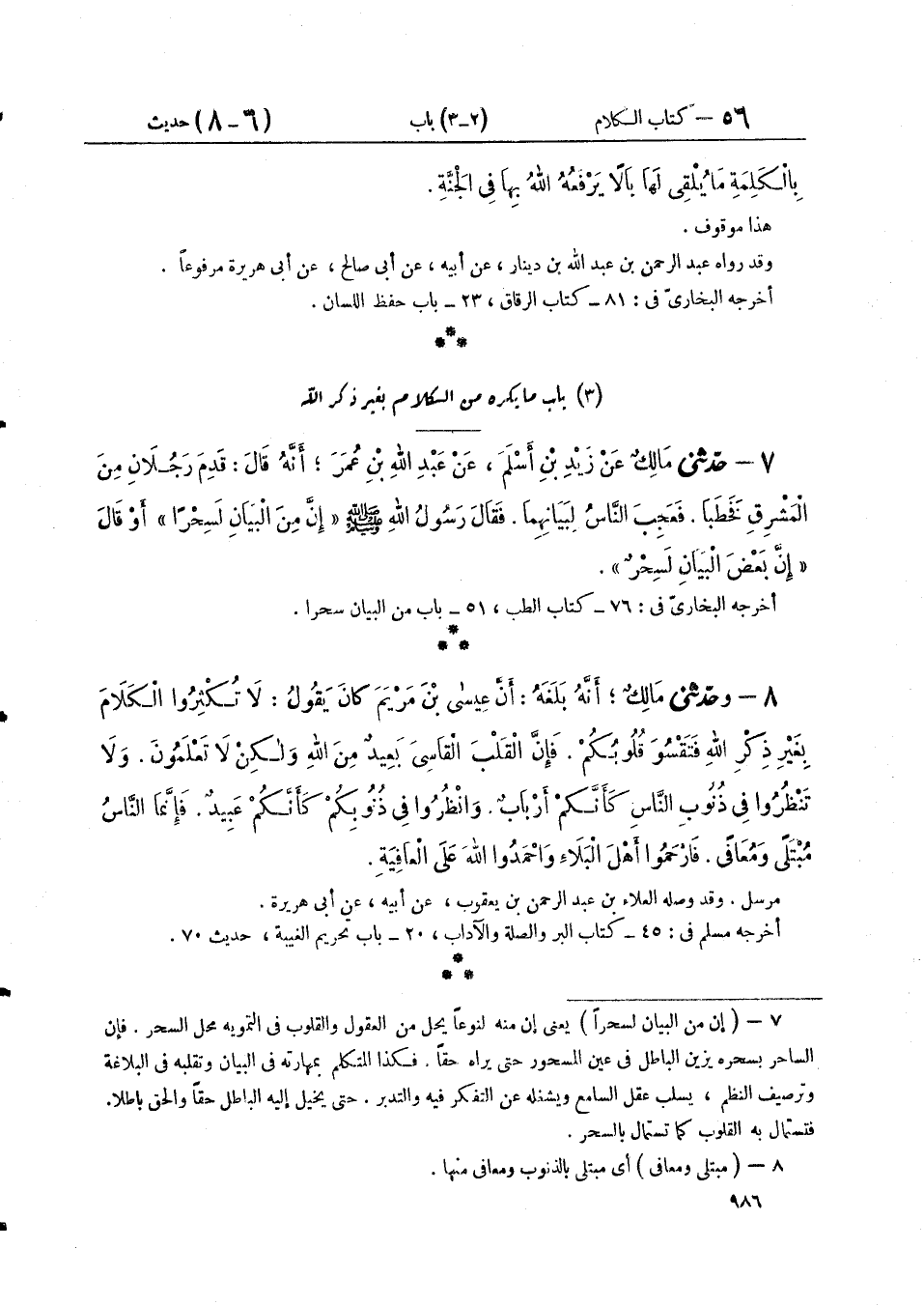 ٧ - حَدَّثَنِي مَالِكٌ، عَنْ زَيْدِ بْنِ أَسْلَمَ، عَنْ عَبْدِ اللَّهِ بْنِ عُمَرَ، أَنَّهُ قَالَ: قَدِمَ رَجُلَانِ مِنَ الْمَشْرِقِ فَخَطَبَا، فَعَجِبَ النَّاسُ لِبَيَانِهِمَا، فَقَالَ رَسُولُ اللَّهِ صَلَّى اللهُ عَلَيْهِ وَسَلَّمَ: «إِنَّ مِنَ الْبَيَانِ لَسِحْرًا» - أَوْ قَالَ: «إِنَّ بَعْضَ الْبَيَانِ لَسِحْرٌ»