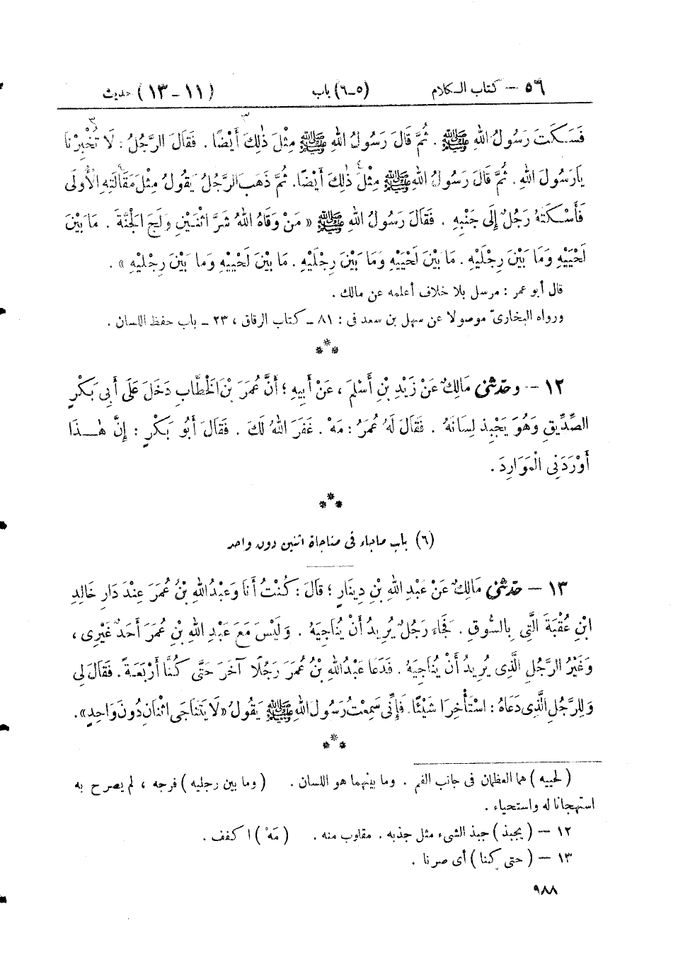 ١٣ - وَحَدَّثَنِي مَالِكٌ، عَنْ عَبْدِ اللَّهِ بْنِ دِينَارٍ، قَالَ: كُنْتُ أَنَا وَعَبْدُ اللَّهِ بْنُ عُمَرَ عِنْدَ دَارِ خَالِدِ بْنِ عُقْبَةَ الَّتِي بِالسُّوقِ، فَجَاءَ رَجُلٌ يُرِيدُ أَنْ يُنَاجِيَهُ، وَلَيْسَ مَعَ عَبْدِ اللَّهِ بْنِ عُمَرَ أَحَدٌ غَيْرِي، وَغَيْرُ الرَّجُلِ الَّذِي يُرِيدُ أَنْ يُنَاجِيَهُ، فَدَعَا عَبْدُ اللَّهِ بْنُ عُمَرَ رَجُلًا آخَرَ حَتَّى كُنَّا أَرْبَعَةً، فَقَالَ لِي وَلِلرَّجُلِ الَّذِي دَعَاهُ: اسْتَأْخِرَا شَيْئًا، فَإِنِّي سَمِعْتُ رَسُولَ اللَّهِ صَلَّى اللهُ عَلَيْهِ وَسَلَّمَ يَقُولُ: «لَا يَتَنَاجَى اثْنَانِ دُونَ وَاحِدٍ»
