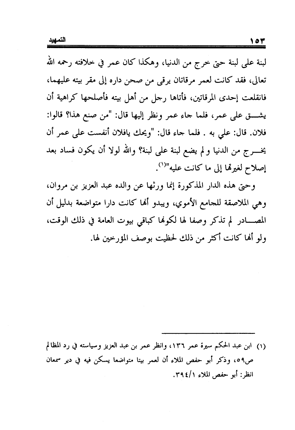 لبنة على لبنة حتى خرج من الدنيا، وهكذا كان عمر في خلافته رحمه الله تعالى، فقد كانت لعمر مرقاتان يرقى من صحن داره إلى مقر بيته عليهما، فانقلعت إحدى المرقاتين، فأتاها رجل من أهل بيته فأصلحها كراهية أن يشق على عمر، فلما جاء عمر ونظر إليها قال: "من صنع هذا؟ قالوا: فلان. قال: علي به. فلما جاء قال: "ويحك يا فلان أنفست على عمر أن يخرج من الدنيا ولم يضع لبنة على لبنة؟ والله لولا أن يكون فساد بعد إصلاح لغيرتها إلى ما كانت عليه"1.