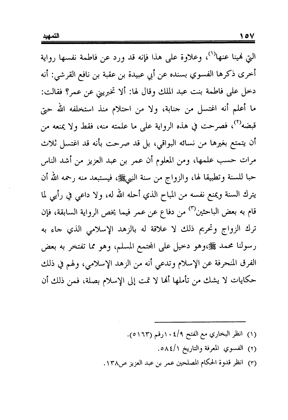التي نهينا عنها1، وعلاوة على هذا فإنه قد ورد عن فاطمة نفسها رواية أخرى ذكرها الفسوي بسنده عن أبي عبيدة بن عقبة بن نافع القرشي: أنه دخل على فاطمة بنت عبد الملك وقال لها: ألا تخبريني عن عمر؟ فقالت: ما أعلم أنه اغتسل من جنابة، ولا من احتلام منذ استخلفه الله حتى قبضه2، فصرحت في هذه الرواية على ما علمته منه، فقط ولا يمنعه من أن يتمتع بغيرها من نسائه البواقي، بل قد صرحت بأنه قد اغتسل ثلاث مرات حسب علمها، ومن المعلوم أن عمر بن عبد العزيز من أشد الناس حبا للسنة وتطبيقا لها، والزواج من سنة النبي صلى الله عليه وسلم, فيستبعد منه رحمه الله أن يترك السنة ويمنع نفسه من المباح الذي أحله الله له، ولا داعي في رأيي لما قام به بعض الباحثين3 من دفاع عن عمر فيما يخص الرواية السابقة، فإن ترك الزواج وتحريم ذلك لا علاقة له بالزهد الإسلامي الذي جاء به رسولنا محمد صلى الله عليه وسلم، وهو دخيل على المجتمع المسلم، وهو مما تفتخر به بعض الفرق المنحرفة عن الإسلام وتدعي أنه من الزهد الإسلامي، ولهم في ذلك حكايات لا يشك من تأملها أنها لا تمت إلى الإسلام بصلة, فمن ذلك أن