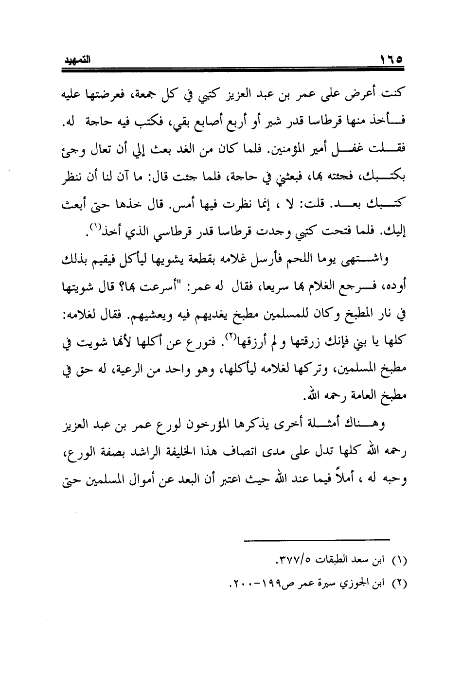 كنت أعرض على عمر بن عبد العزيز كتبي في كل جمعة، فعرضتها عليه فأخذ منها قرطاسا قدر شبر أو أربع أصابع بقي، فكتب فيه حاجة له. فقلت غفل أمير المؤمنين. فلما كان من الغد بعث إلي أن تعال وجئ بكتبك، فجئته بها، فبعثني في حاجة، فلما جئت قال: ما آن لنا أن ننظر كتبك بعد. قلت: لا، إنما نظرت فيها أمس. قال خذها حتى أبعث إليك. فلما فتحت كتبي وجدت قرطاسا قدر قرطاسي الذي أخذ1.